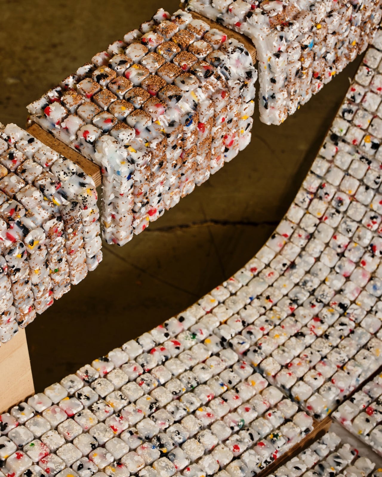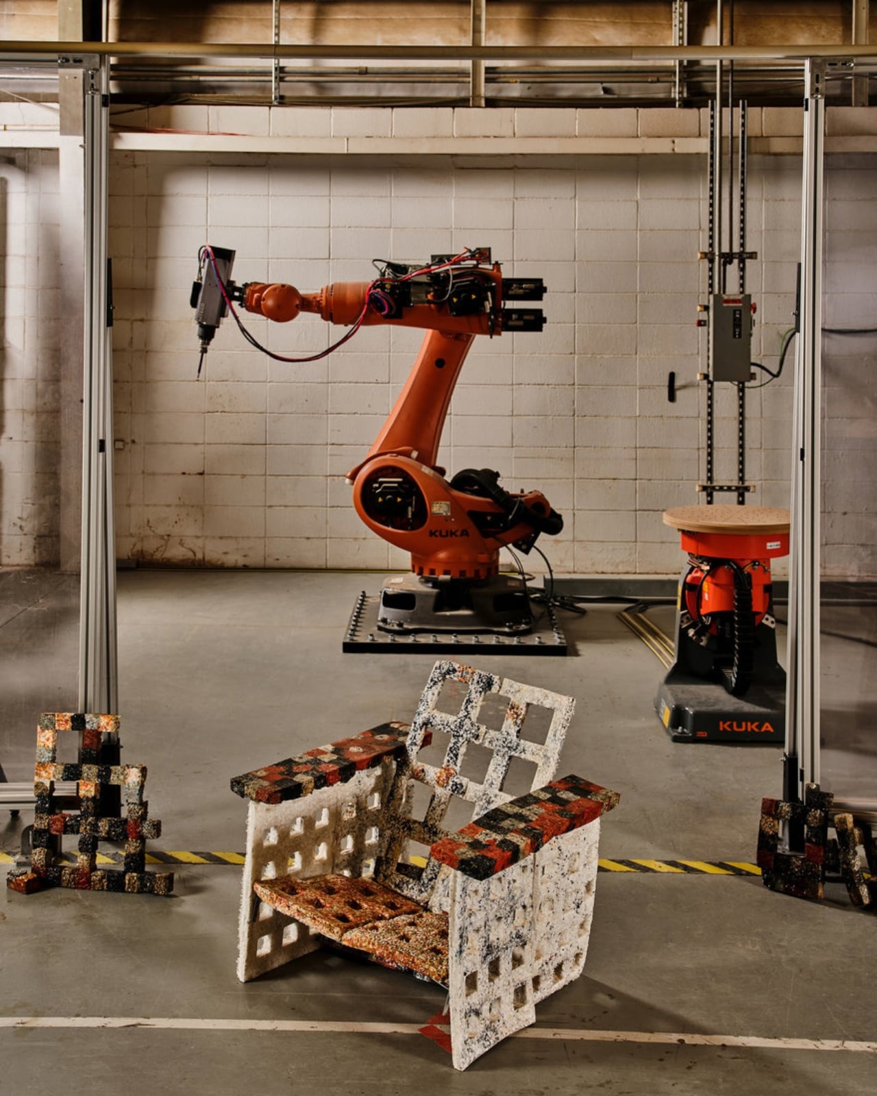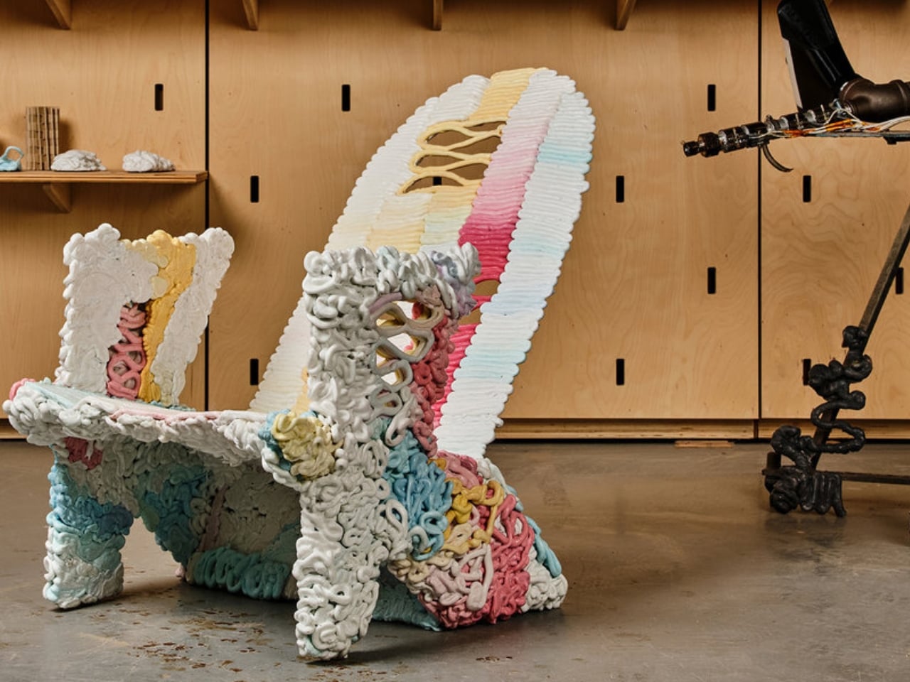The individual pieces have names and personalities. There’s Vincent, with its hand-shaped forms and marbled surfaces. There’s Modu-Chair, built from cubic modules that echo quilting patterns. And Framework, a translucent lattice structure that reimagines what an Adirondack chair can even be. Each one asks the same question in a different way: what if we stopped seeing plastic as garbage and started seeing it as potential?