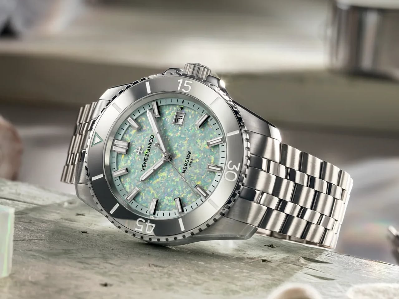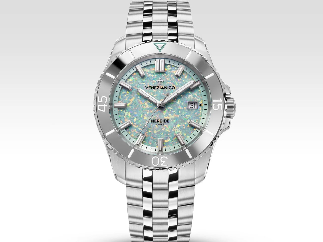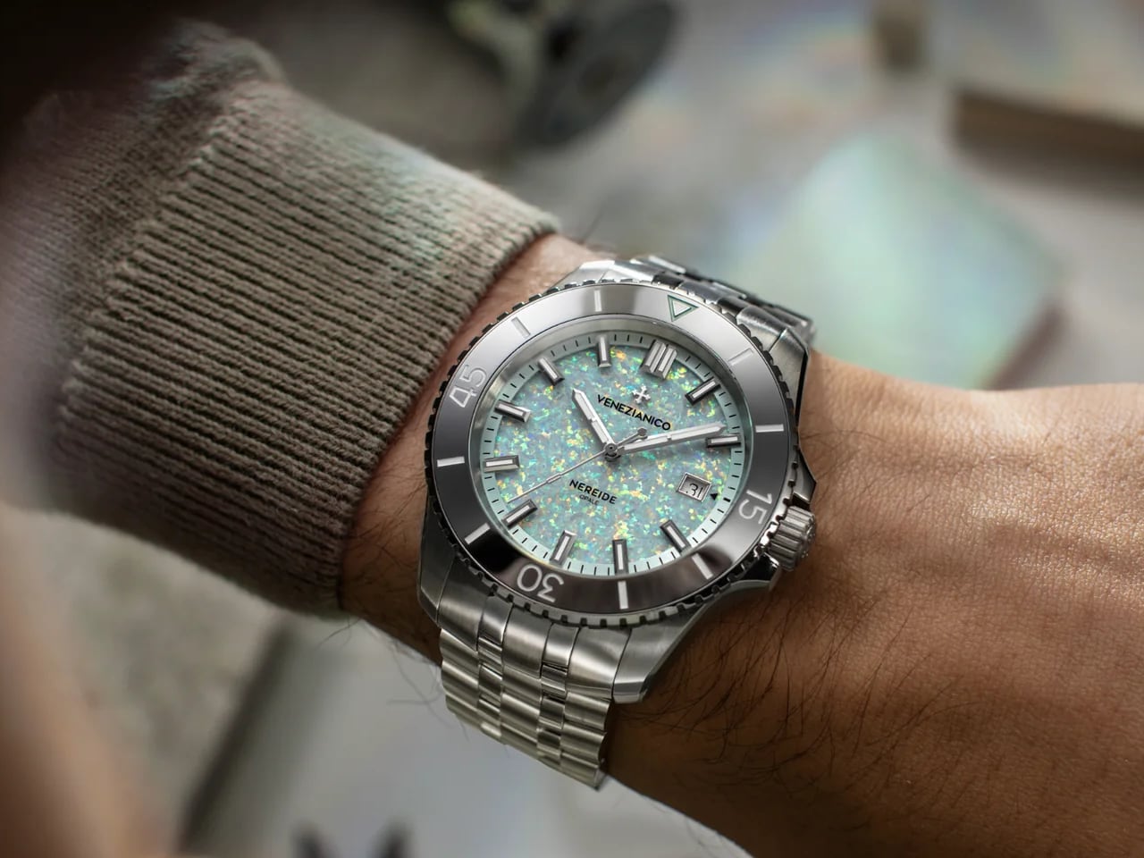 Venezianico’s bet is straightforward: a dial material can carry a watch in a market saturated with homages and heritage plays. The Nereide Opale stakes everything on that slab of lab-grown stone. The case, the bracelet, the bezel, the movement: all of it exists to frame the opal and let the color do the work.