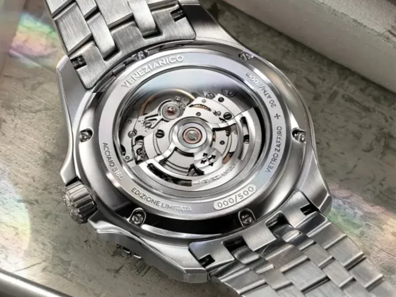 The design bet is specific. Venezianico assumes a buyer who already owns the matte-dial diver, the heritage reissue, the affordable Swiss workhorse. This watch exists for the collector who wants to break the pattern, to own something that photographs like nothing else in the box.