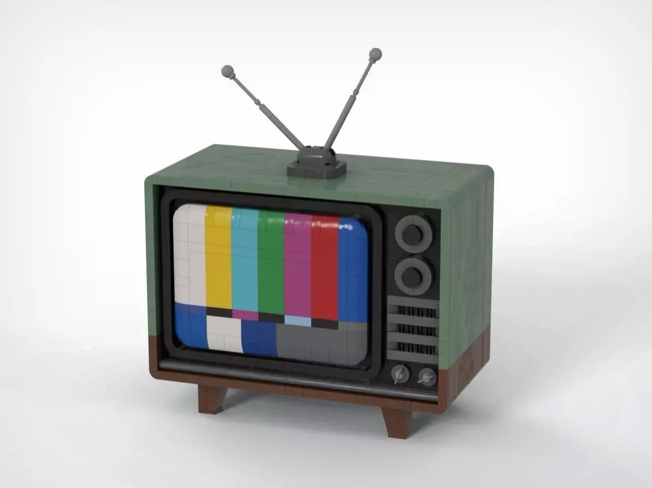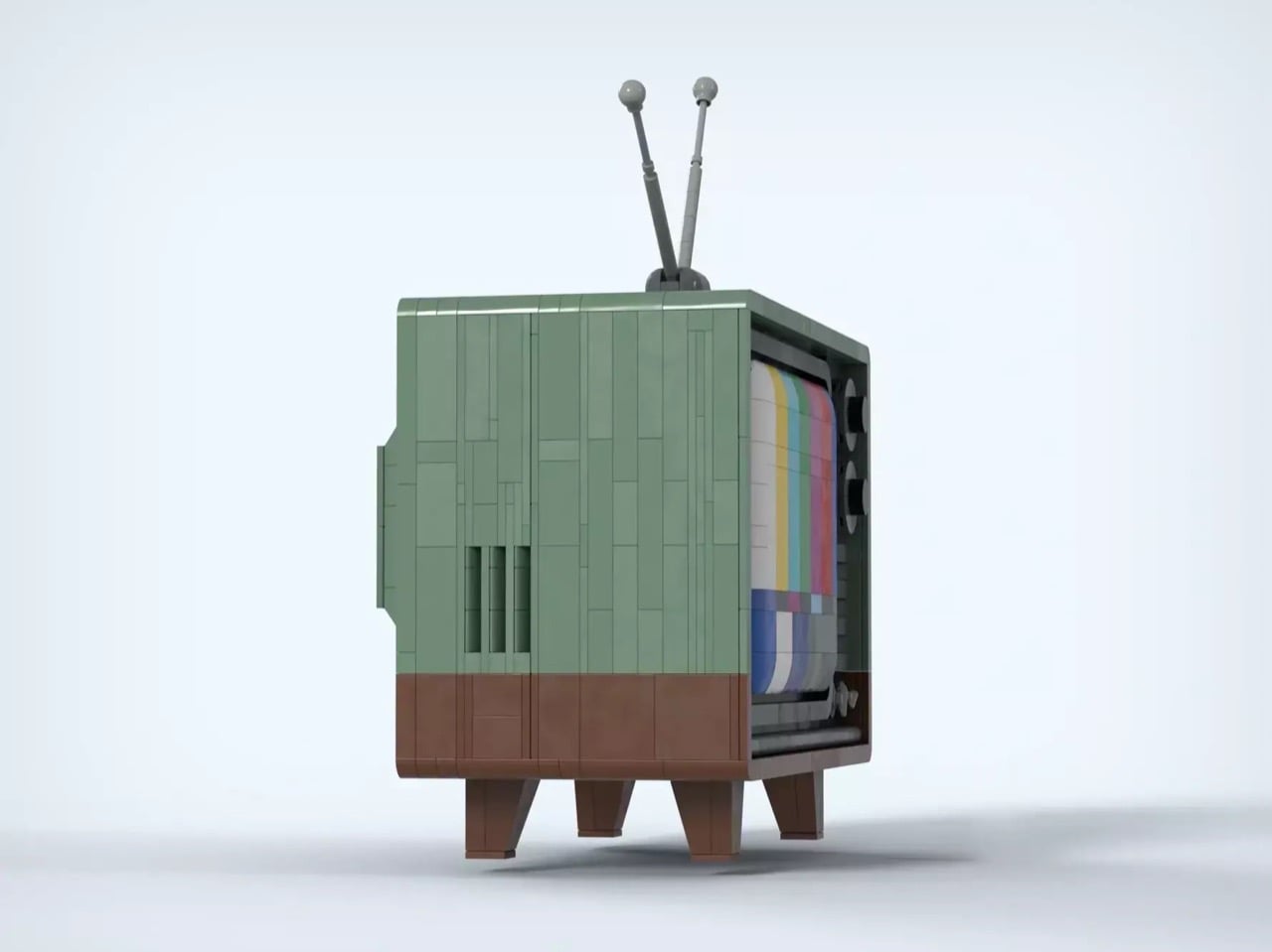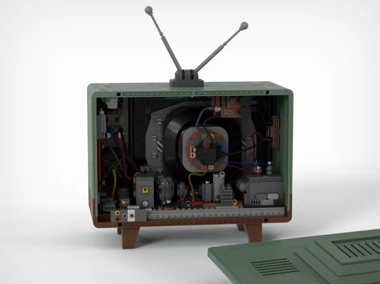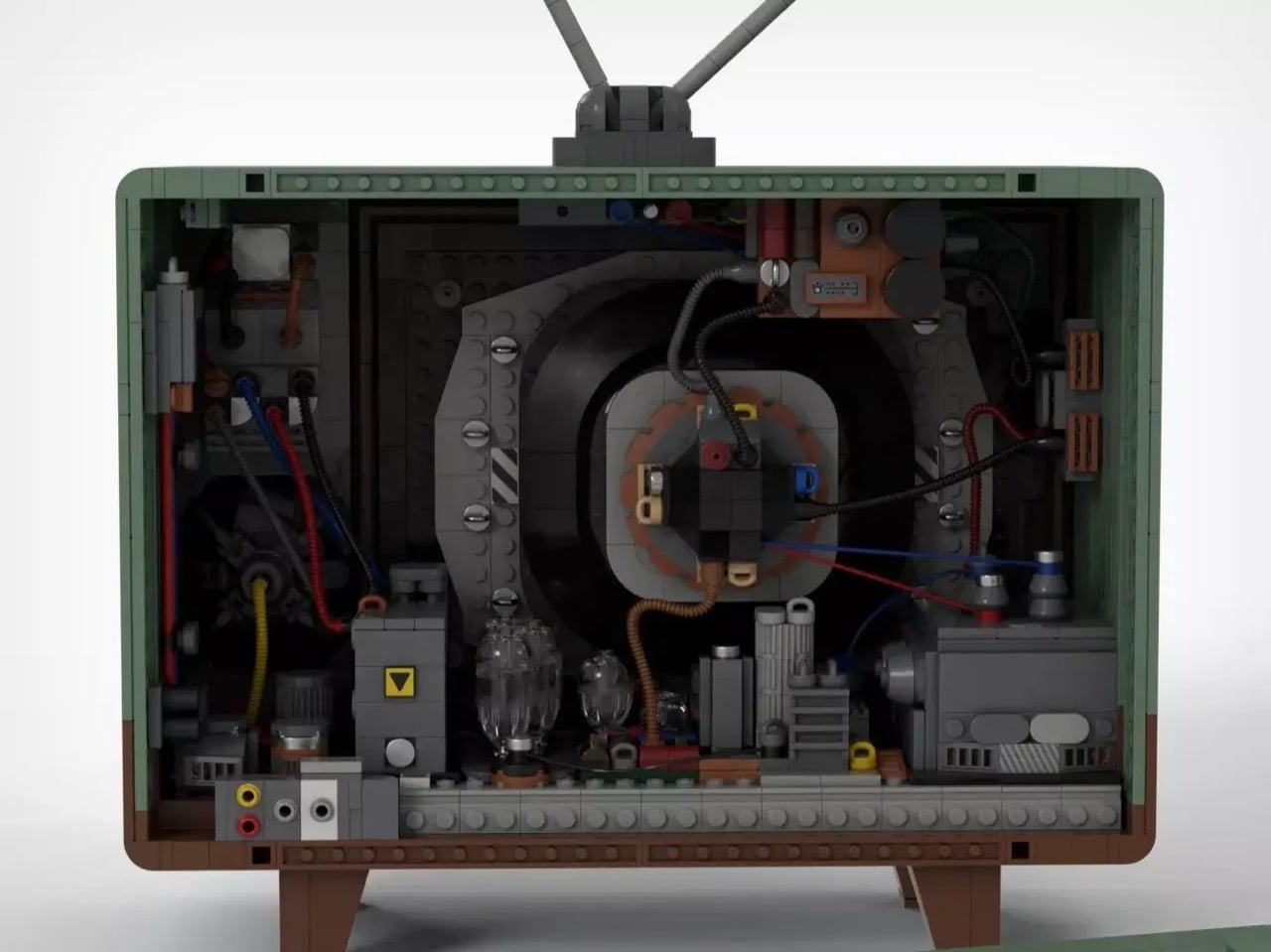 The exterior immediately transports viewers back several decades with its mint green housing, classic rabbit ear antenna, and the unmistakable SMPTE color bars displayed on its gently curved screen. Remove the back panel, however, and the true engineering achievement reveals itself. Every major component of a vintage television has been faithfully recreated in brick form, from the deflection coils wrapped around the CRT neck to the colorful wiring snaking between vacuum tubes and capacitors along the chassis floor.