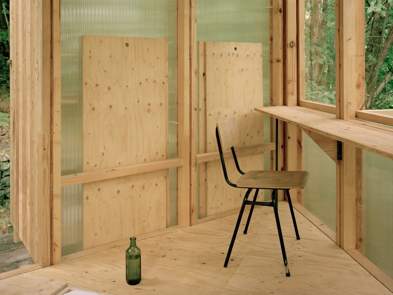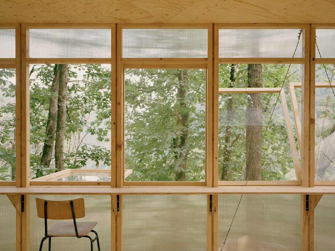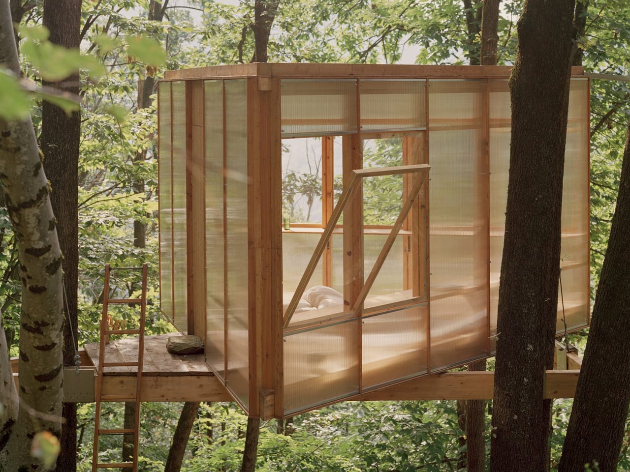Architect Olin Petzold embraced the constraints. The resulting structure balances on three trees, its triangular form rising from the woodland floor like a geometric bird’s nest. Wood and translucent polycarbonate panels wrap the exterior, filtering dappled light into the compact interior. Located roughly 150 meters from the main house, the treehouse functions as a writing studio, guest room, and personal retreat.