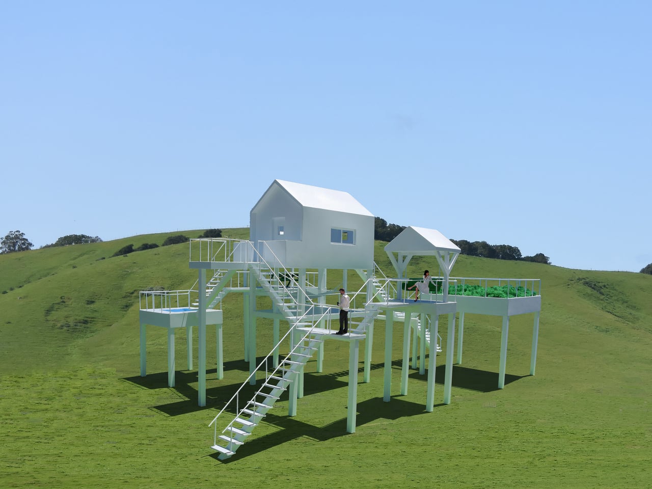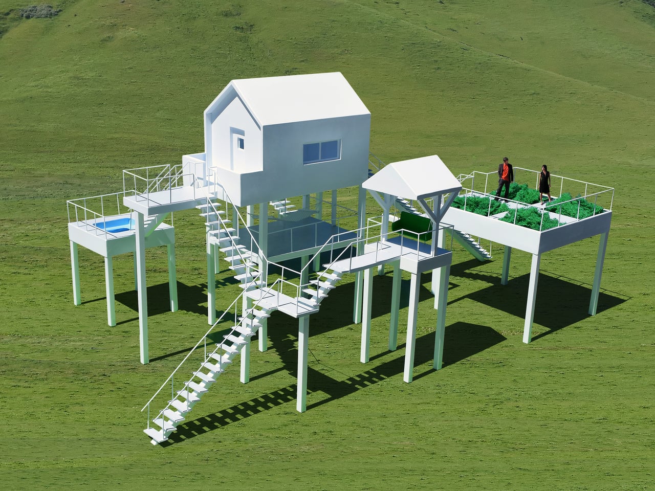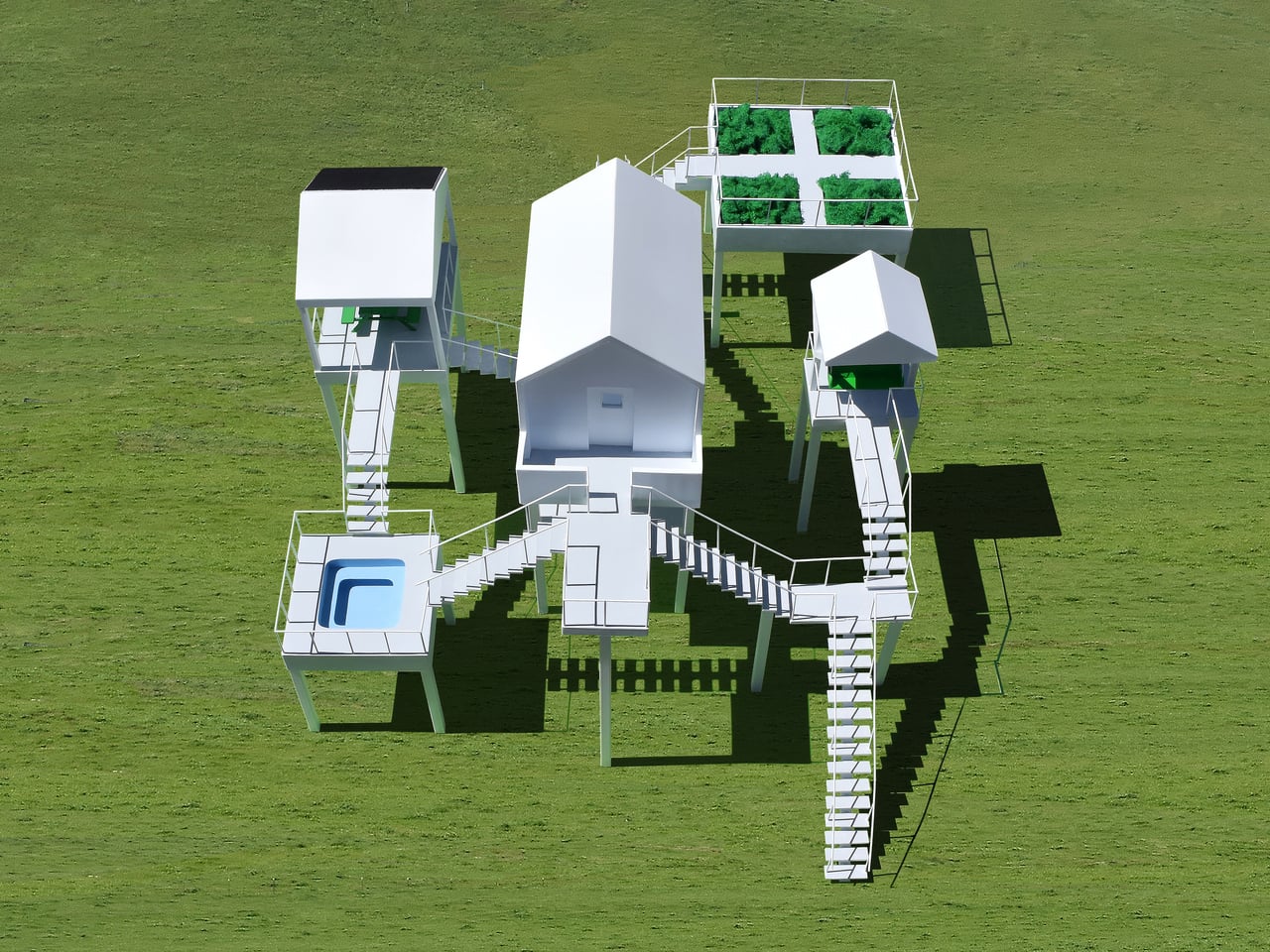 The Elevated Leisure Habitat is a functional art structure meant to be rented as a very special vacation place. This first version is designed for two people and consists of a small central house surrounded by a series of elevated platforms, each dedicated to a single leisure activity. Instead of one building with a yard, you get a loose constellation of outdoor rooms in the sky, linked by stairs and landings.