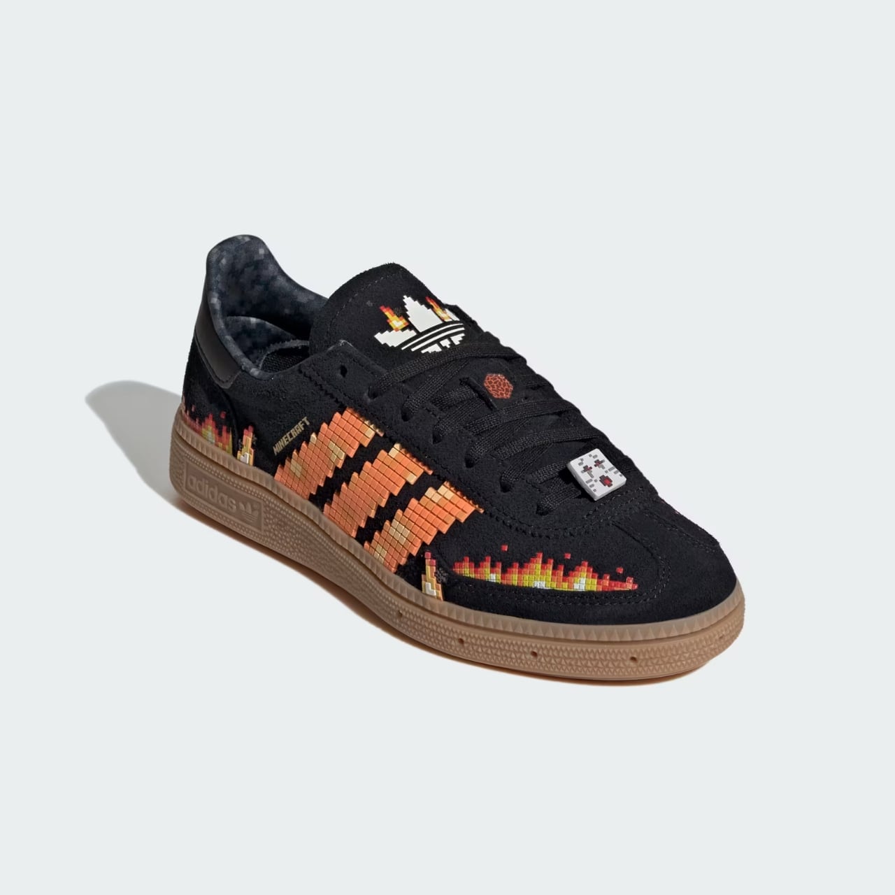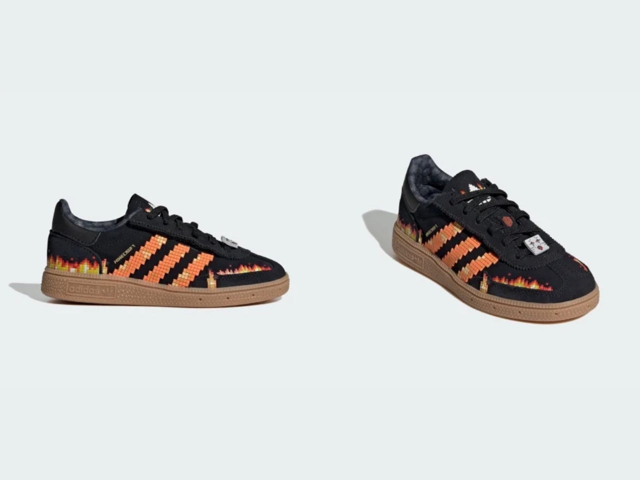 The Handball Spezial takes a different approach with its Ghast theme. For those not fluent in Minecraft speak, the Ghast is that floating, fireball-spewing creature you encounter in the game’s Nether dimension. Flame graphics dance across the shoe while an illustrated Ghast appears on the laces, giving the piece a narrative quality that goes beyond simple branding.