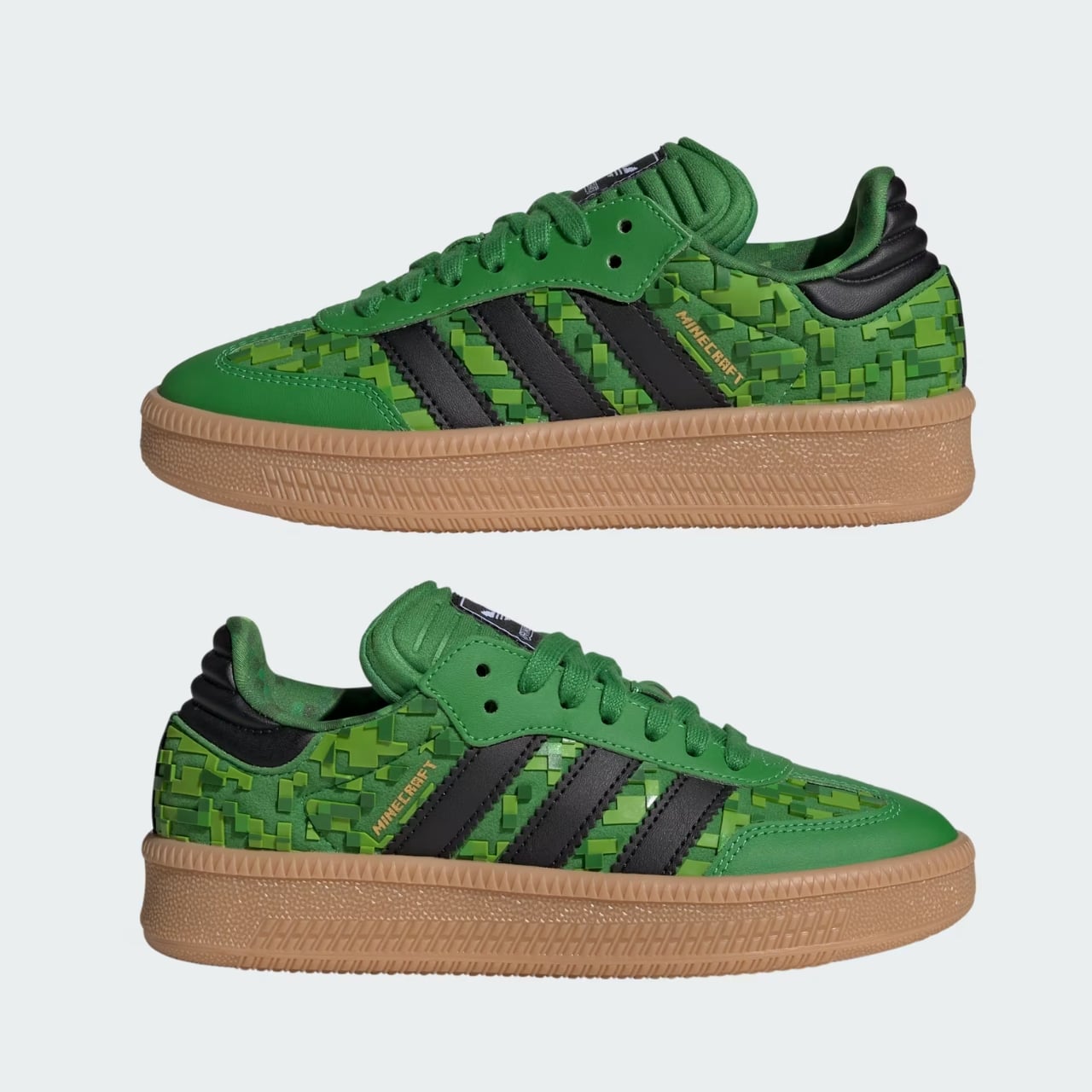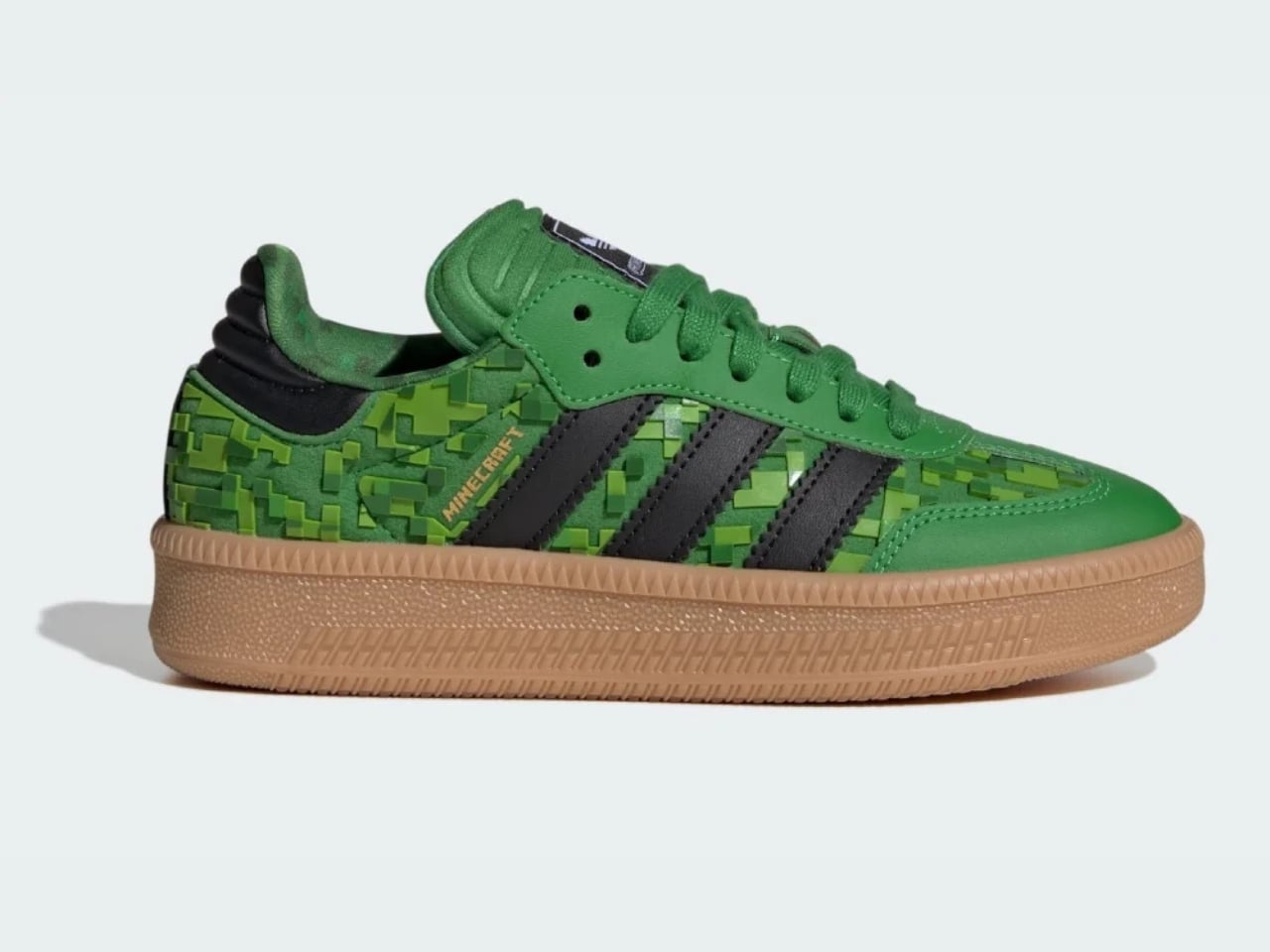 Take the Samba XLG inspired by the Creeper, arguably Minecraft’s most recognizable character. The shoe arrives in that signature explosive green colorway with blocky graphics spread across the upper, while a gum sole keeps things grounded in classic Samba DNA. It’s playful without being costume-y, which is exactly the balance you want in a collaboration like this.