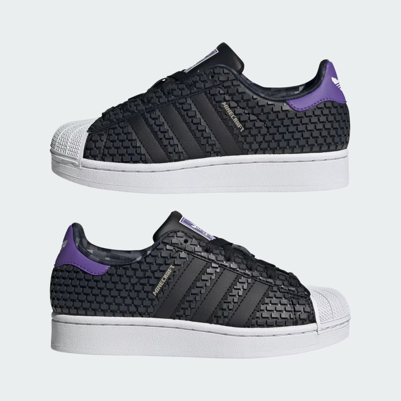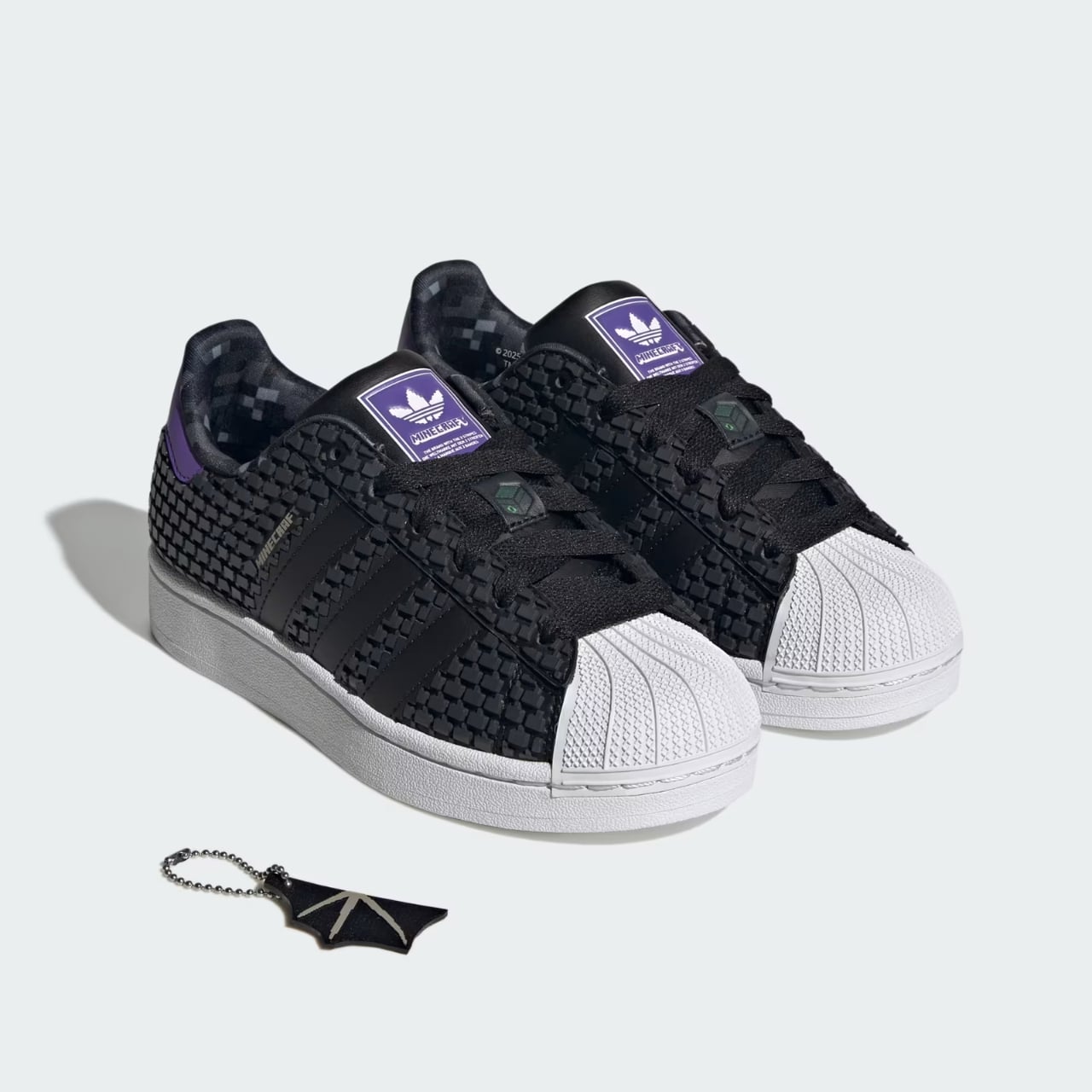 Then there’s the Campus 00s channeling the Eye of Ender aesthetic with its black and green palette, and the Superstar II drawing inspiration from the Ender Dragon itself. The Superstar features black, block-like scales that translate the dragon’s texture into something you can actually wear on city streets. The Adilette slides circle back to Creeper territory, with the mob’s iconic face prominently displayed on the strap.