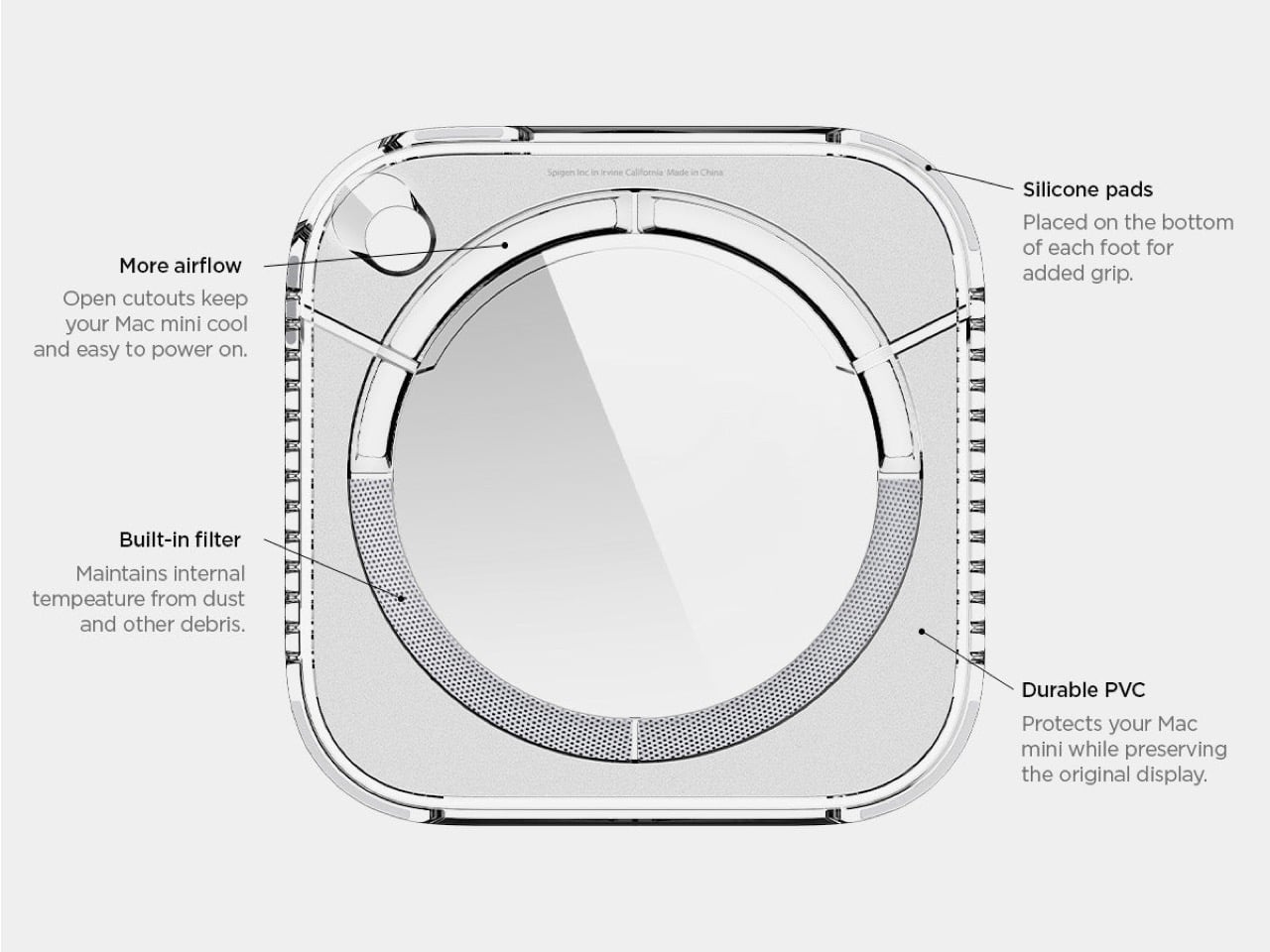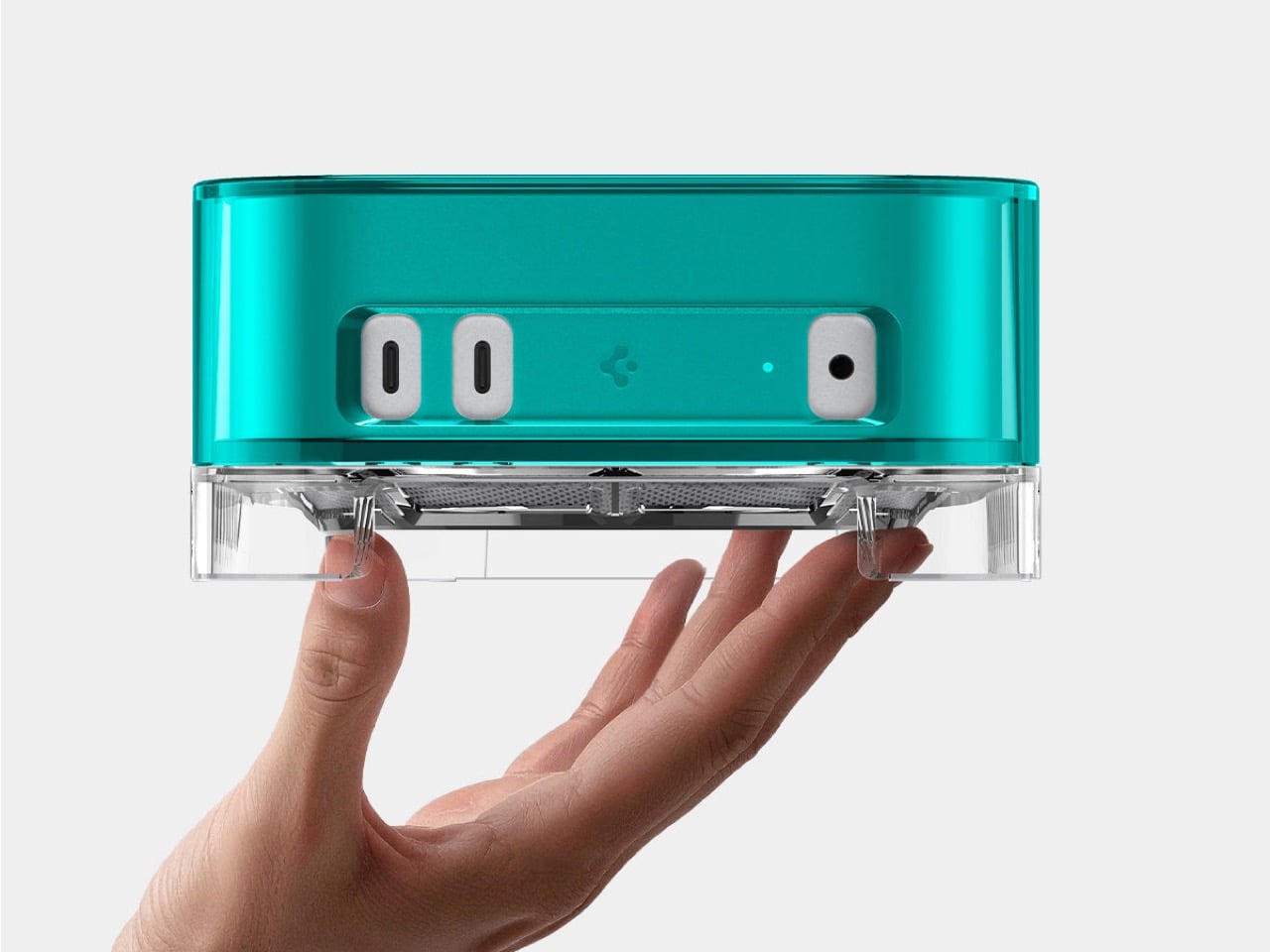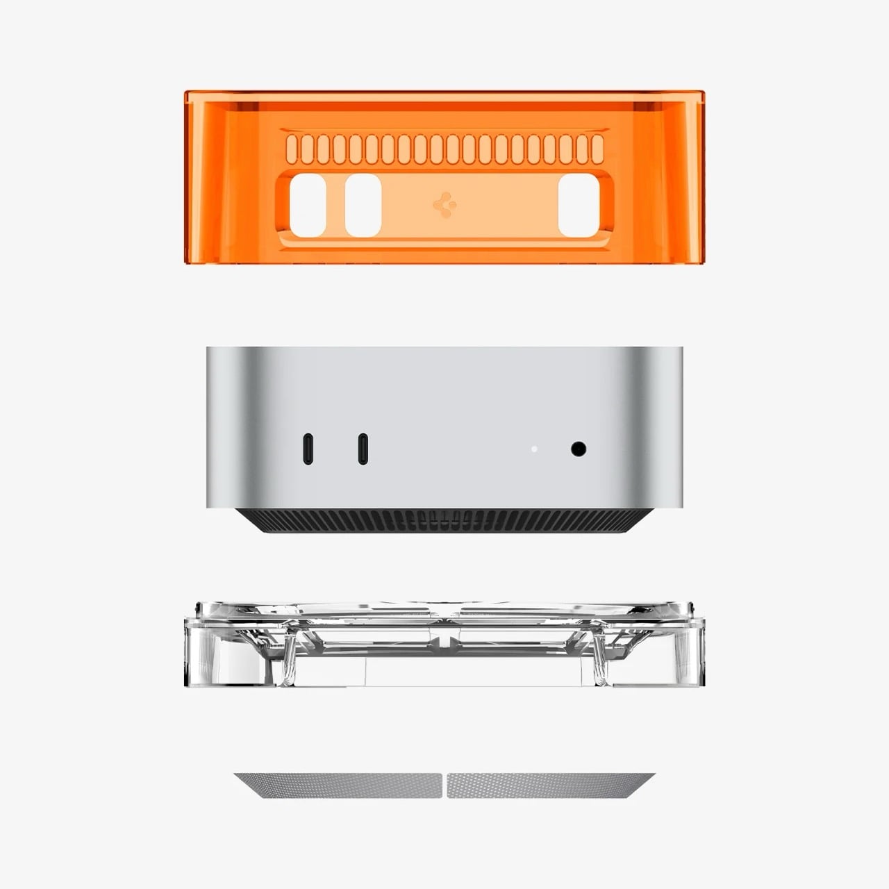 It’s the smaller, nerdier details that really sell the execution. The vertical grilles on the sides are a direct homage to the Power Mac G4 Cube, yet they also provide functional ventilation for a machine that can get surprisingly warm. That clear base also elevates the entire unit just enough to improve airflow from below, and the inclusion of a simple dust filter is a practical touch most companies would skip. This is what separates a thoughtful tribute from a lazy cash-grab, proving someone at Spigen actually did their homework on Apple’s golden age.