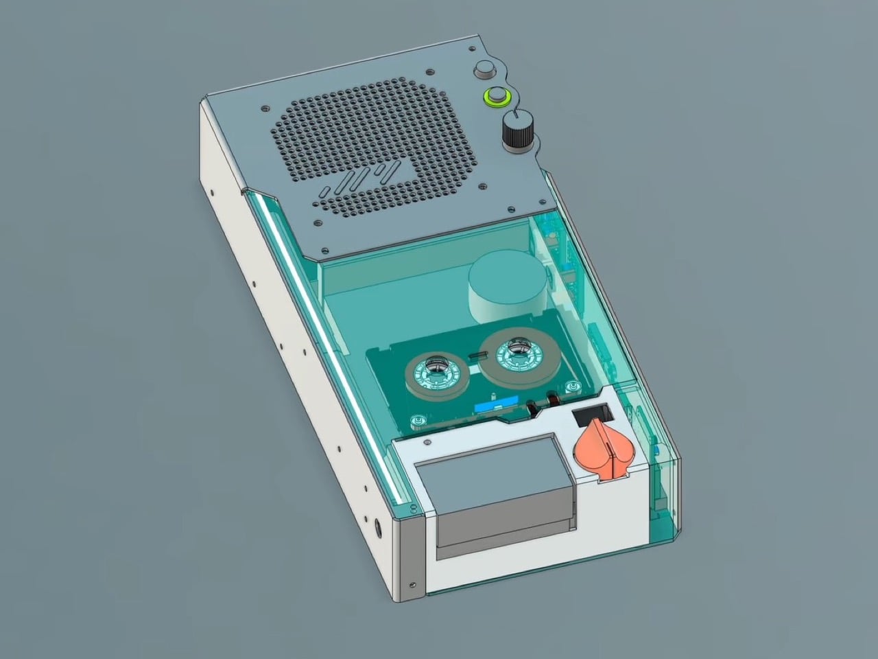 The concept is straightforward. Bluetooth audio arrives digitally, converts to analog, mixes from stereo to mono, records onto cassette tape, travels around the loop, hits a playback head, then reaches the speaker. That physical trip through magnetic tape creates the warmth people obsess over. The compression happens because ferric oxide particles on polyester film genuinely can’t capture digital audio’s full range. These are real physical limitations making the sound different, and somehow our ears prefer it that way. Julius made the tape loop visible on purpose, sitting outside the cassette with orange guide brackets so you watch it move while listening.