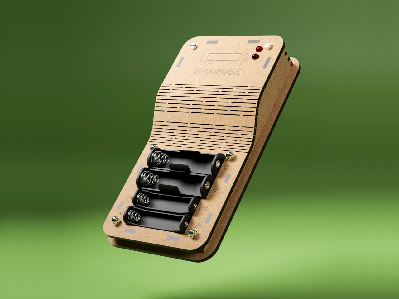 RegenBox 1 changes the way you look at dead alkalines. Instead of being the end of the story, they become candidates for triage, measurement, and careful regeneration. The wooden box on the bench is a reminder that design can intervene not just at the point of purchase, but at the moment we usually give up on an object, asking whether it really needs to be thrown away yet or if a slow, gentle charge might bring it back for another round.
