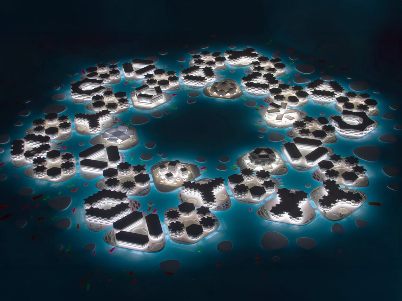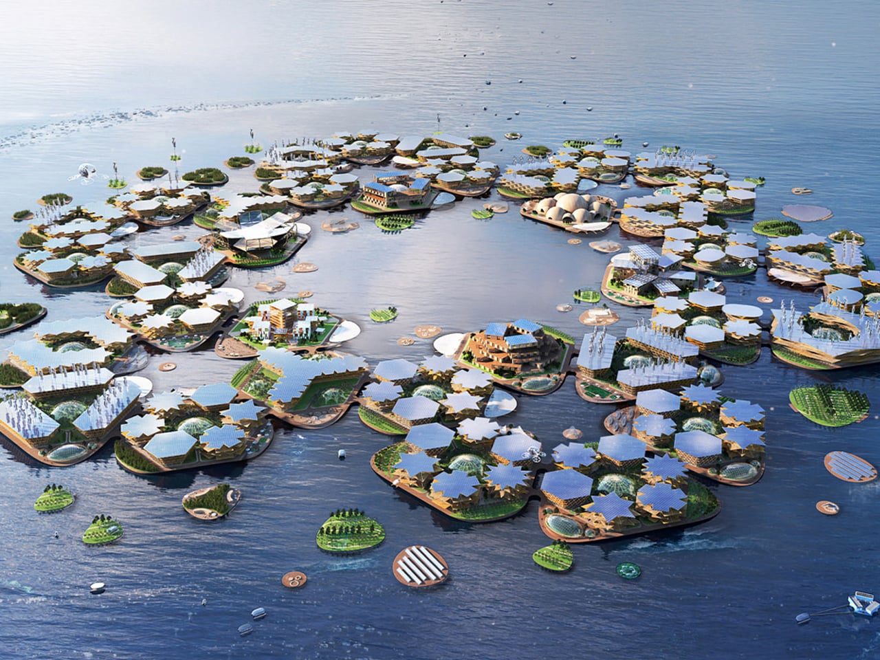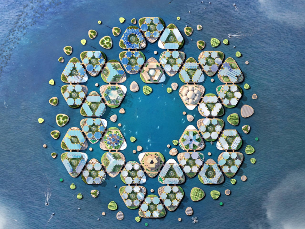OCEANIX is an innovative floating city concept developed by BIG, Bjarke Ingels Group, envisioned for construction off the coast of South Korea. The project has received approval from UN-Habitat and the Metropolitan City of Busan, moving it closer to reality. Designed as a fully sustainable habitat, each 2-hectare module houses around 300 residents, and multiple modules can connect to form a 1,650-person village. These floating neighborhoods integrate underwater farming, greenhouses, and renewable energy systems to support long-term self-sufficiency. Residents can move easily on foot or by boat between the interconnected platforms.