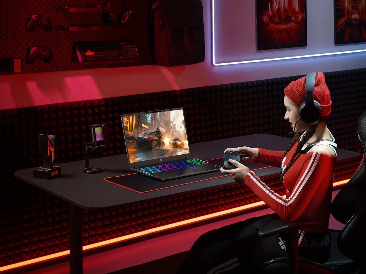 Nitro V 16 AI is the AMD-powered gaming laptop that still has to behave like a normal computer when the game is closed. It pairs up to an AMD Ryzen AI 9 465 processor with up to an NVIDIA GeForce RTX 5070 Laptop GPU, backed by up to 32 GB of DDR5 memory and up to 2 TB of PCIe M.2 NVMe SSD storage. That combination is built for high-refresh shooters and GPU-accelerated creative work, not just casual titles.