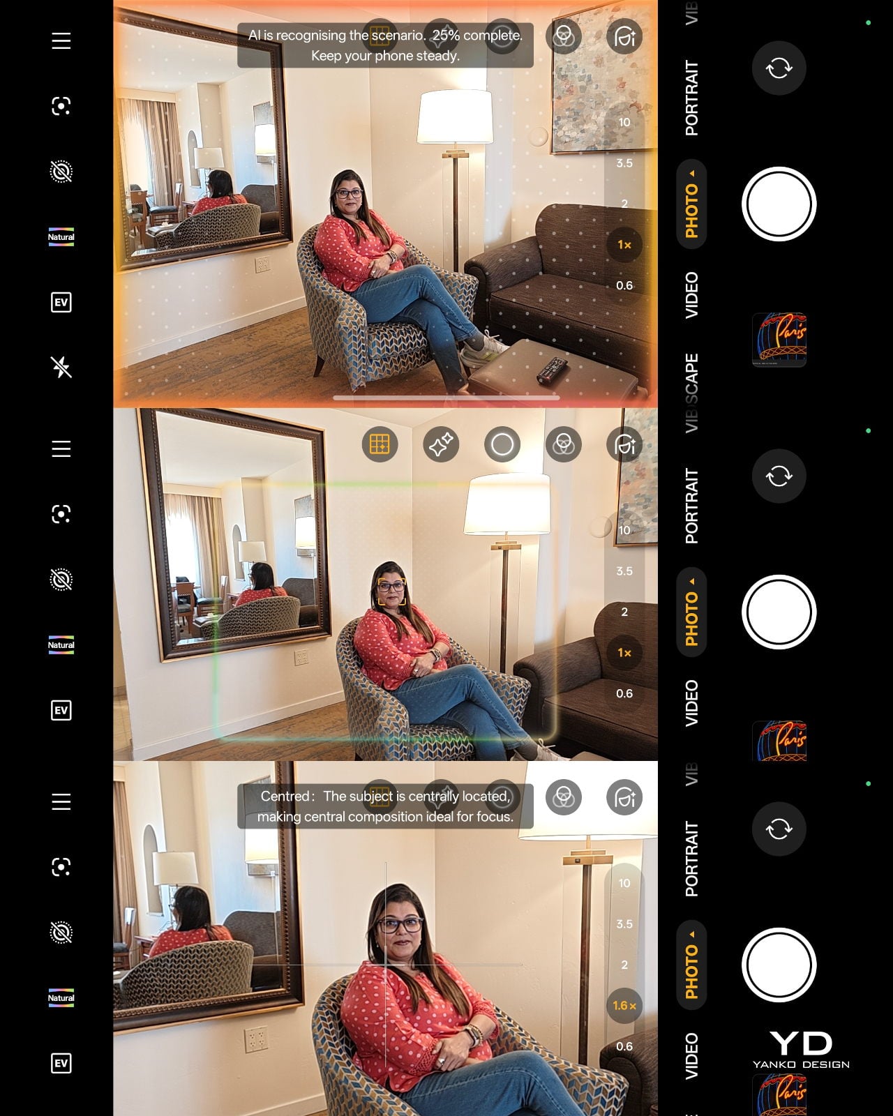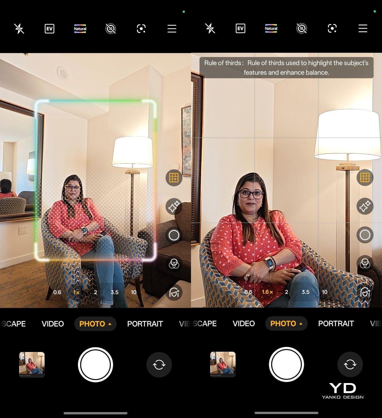 The 23 mm equivalent 200 MP main camera uses Samsung’s HP5 sensor with an f/1.8 aperture lens and both optical and electronic image stabilisation. It can capture very detailed shots with a wide dynamic range in good lighting conditions, and stabilisation helps keep images sharp when light levels drop. In the standard Photo mode, you also get an AI composition feature that analyses your framing and suggests small adjustments for a stronger composition, nudging you to tilt, reframe, or shift your subject for a more balanced shot. This tool is not available in Portrait mode, but it is genuinely helpful for quick point-and-shoot photography.