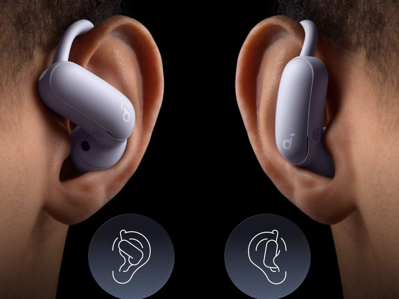 The liquid‑silicone hooks and 56 degrees of articulation keep pressure off the canal for all‑day wear in open‑ear mode, while Adaptive ANC 3.0 checks noise up to 380,000 times per second and makes 180 adjustments per minute in ANC mode. The buds include 11.8 mm drivers, spatial audio with head tracking, LDAC support, IP55 rating, and differing battery lives, up to 7 hours and 34 with case in open‑ear, up to 5 hours and 24 with case in ANC.