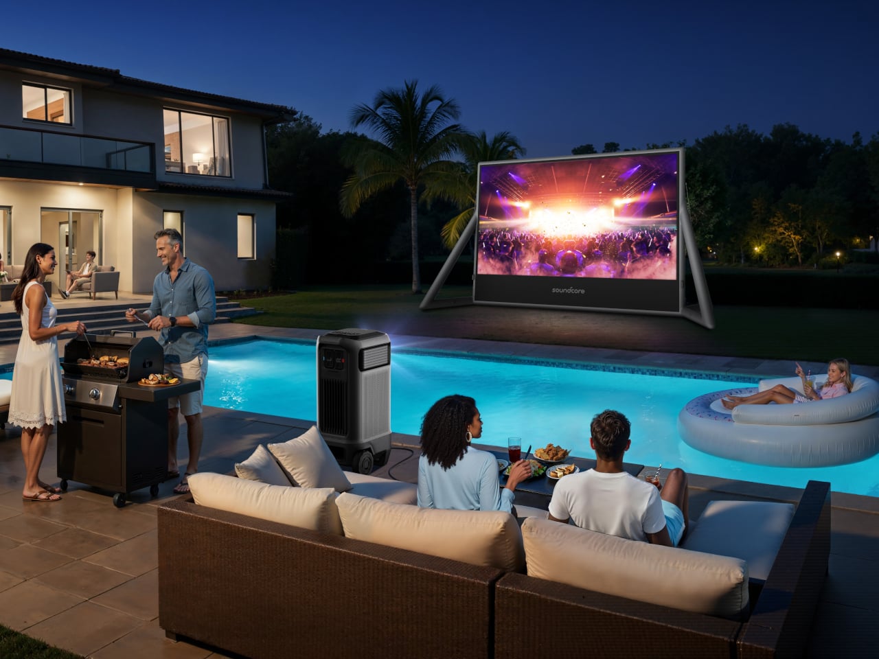 The planned bundle adds a 200‑inch inflatable screen and a wireless pump that inflates in about five minutes and holds air without a constant blower, keeping the system quiet during viewing. Dual wireless microphones and AI spatial adaptation handle setup, tuning sound and image to the space. Together, the projector and screen turn any patch of ground into a temporary cinema without generators, scaffolding, or separate speakers cluttering the site.