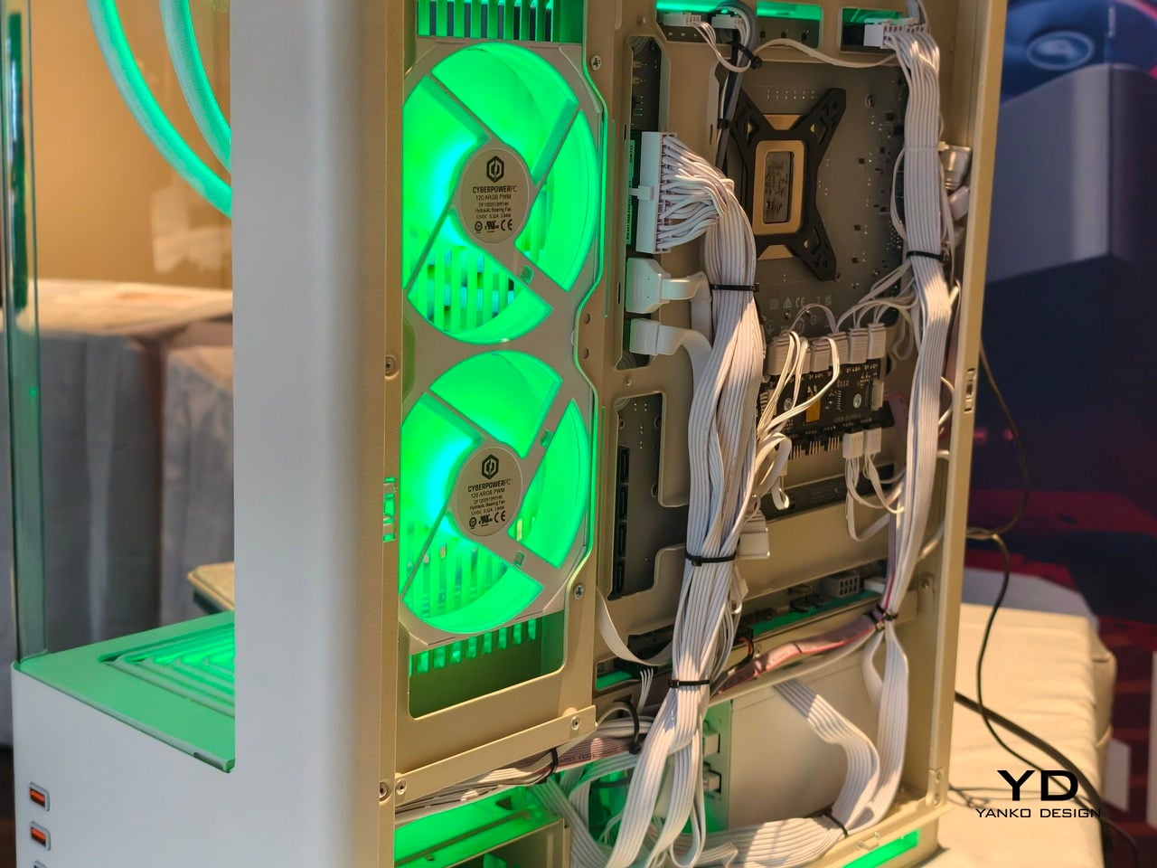 The internal architecture conceals fans, radiators, and cabling behind multi-piece intake covers and internal shrouds, so the interior reads as a clean composition rather than a tangle of parts. The focus shifts to the GPU, cooler, and RAM, which are treated almost like objects on a stage, with consistent geometry and minimal visible mounting points. The chassis does not feel like a kit waiting to be assembled. Rather, it feels like a display case for the hardware that actually matters.