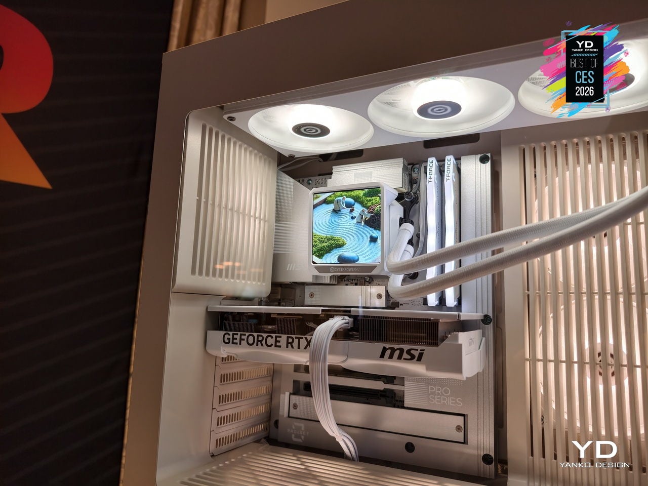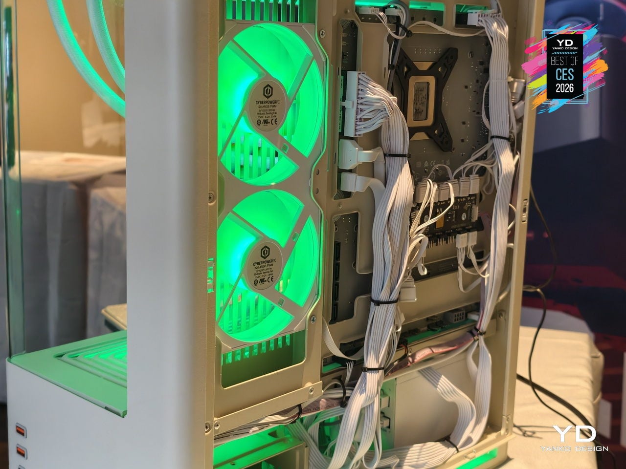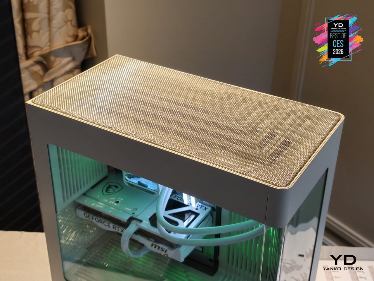 The MA-01 Modern Analog Series chassis from CyberPowerPC treats a gaming tower as something you want visible on a desk. It hides fans, radiators, and cabling behind sculpted vents and shrouds, framing only the GPU, CPU cooler, and memory through pillar-less curved glass. The woven steel mesh top reduces high-frequency resonance, cutting exhaust noise by 20 to 30 percent while moving enough air to keep temperatures controlled.