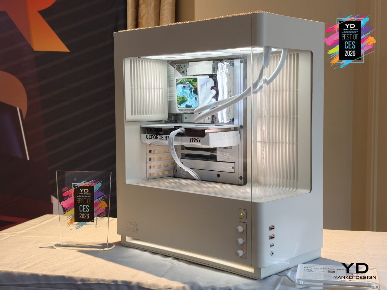 Three analog RGB knobs let you dial through 16.7 million colors and adjust brightness and effects without software. Pressing each knob activates secondary functions, so color, brightness, and lighting modes are controlled with hardware instead of menus. Precision-molded I/O shrouds self-center cables and reduce wear. The MA-01 ships in warm matte off-white, dark steel gray, and metallic dark silver, supporting ATX and BTF motherboards with space for 360 mm radiators and long GPUs.