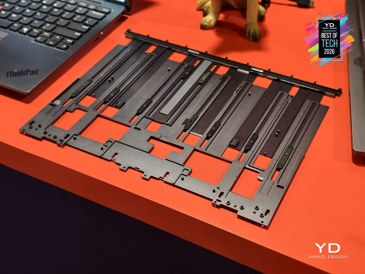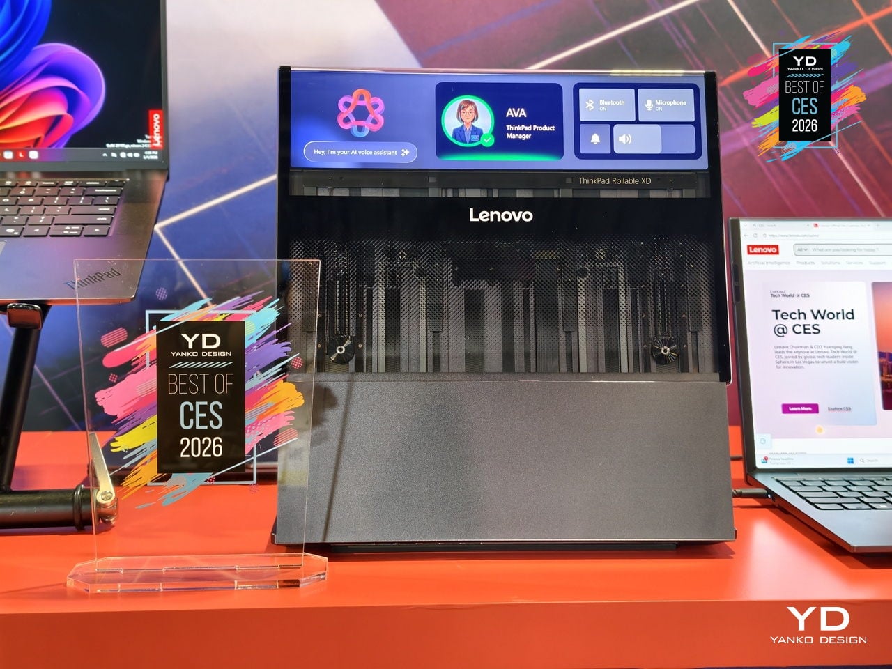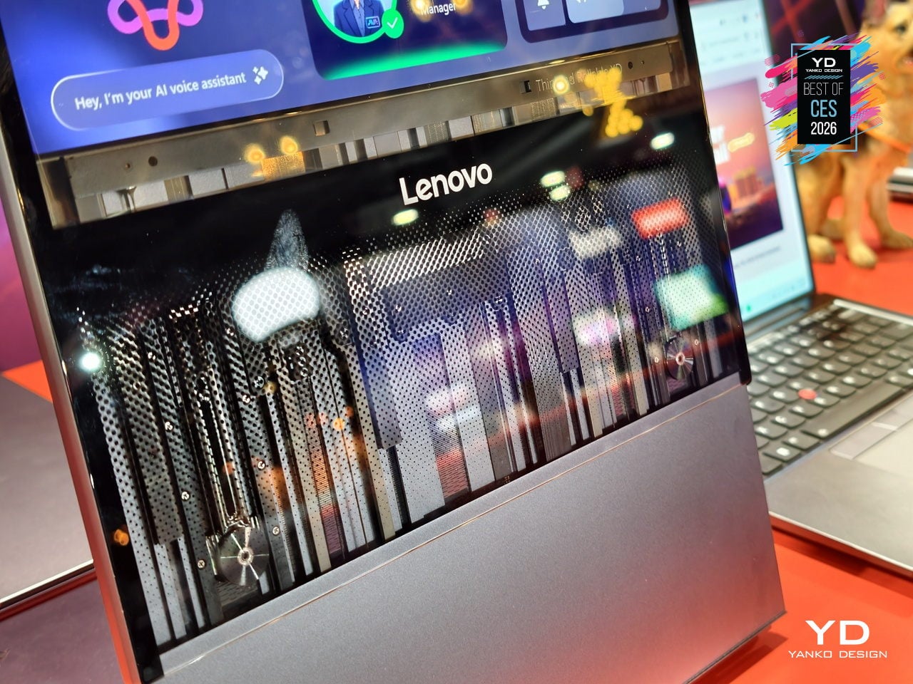 The transparent 180-degree Corning Gorilla Glass Victus 2 cover, jointly developed by Lenovo and Corning, protects the rollable panel while revealing some of the mechanism underneath. The concept keeps familiar ThinkPad cues like the keyboard and TrackPoint, so it still feels like a ThinkPad even as the screen stretches and wraps. It offers a glimpse of laptops that can expand when you need more space and broadcast information outward when you close the lid.
