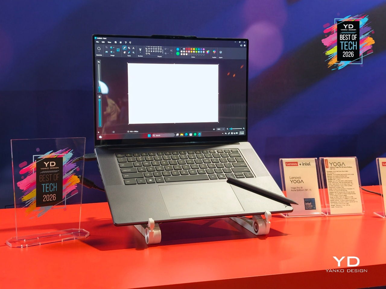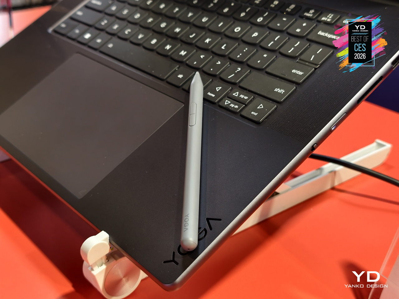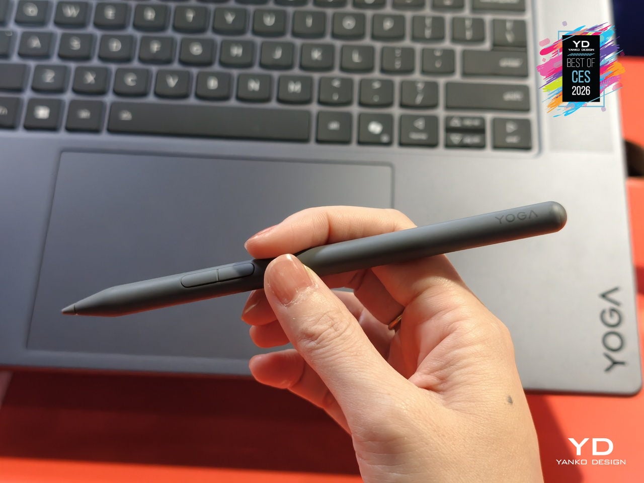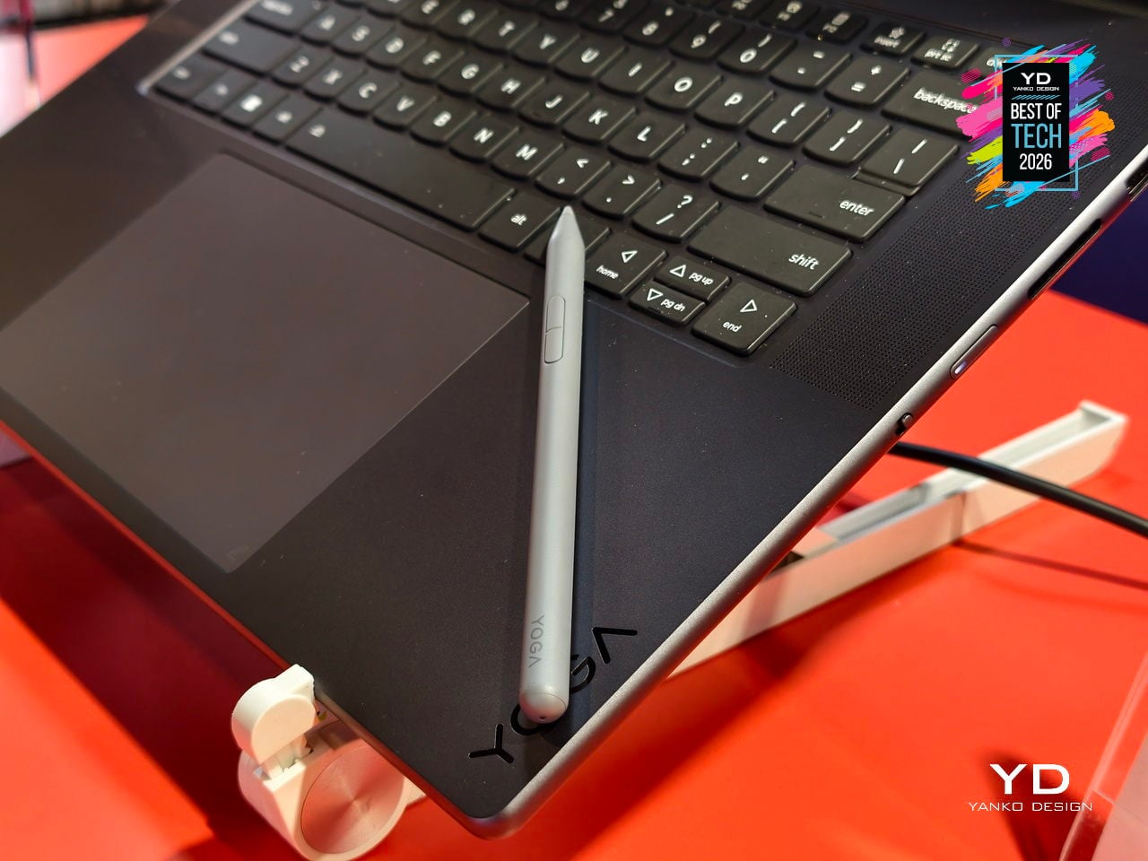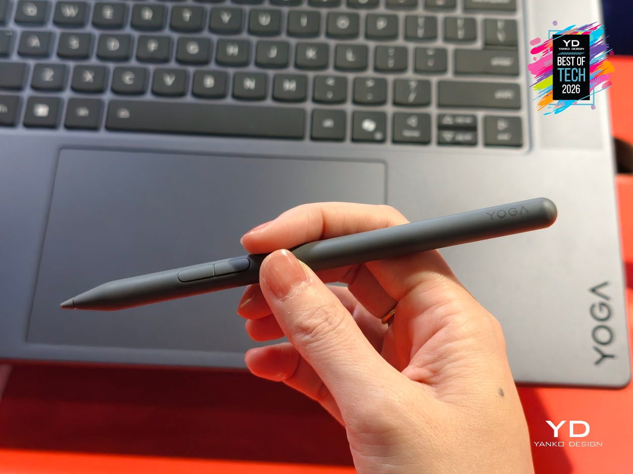 The 16-inch 3.2K PureSight Pro Tandem OLED display runs at a 16:10 aspect ratio, 120Hz variable refresh, and up to 1,600 nits peak brightness, covering 100% of Adobe RGB, P3, and sRGB with Delta E below 1, tuned for Dolby Vision and True Black 1000. The glass Force Pad and included Yoga Pen Gen 2 turn the 150 × 95 mm surface into a sketchpad that automatically disables touch when the pen is in use.