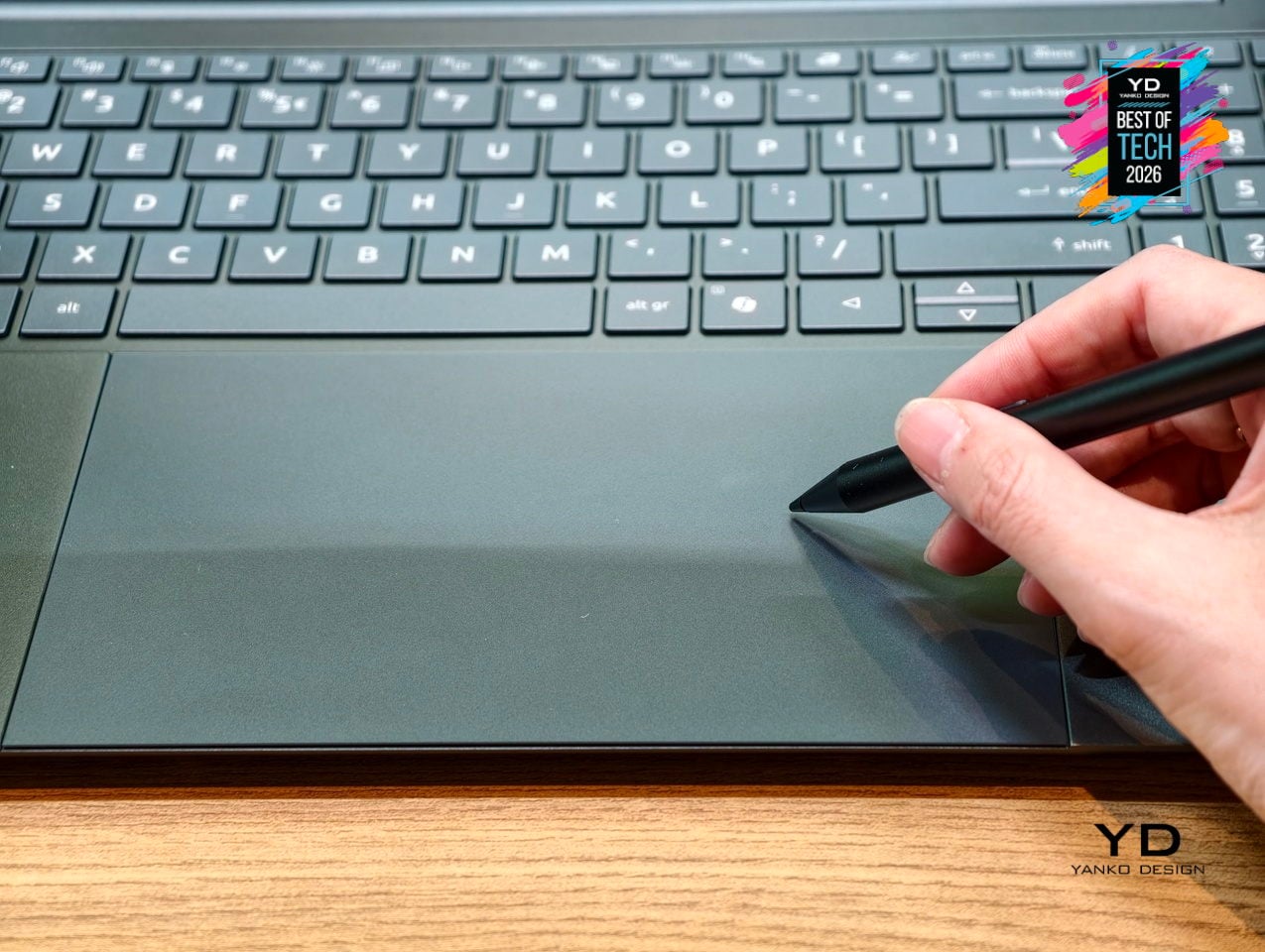 The 16-inch 3K OLED touch display runs at 120 Hz with 100 % DCI-P3 color and DisplayHDR True Black 500 certification, covering photo editing, video grading, and fast scrolling in one tall 16:10 canvas. Below it sits the world’s largest haptic touchpad, measuring 175.5 × 109.7 mm and supporting MPP 2.5 stylus input, turning the palm rest into a secondary drawing surface for sketching, animating, and editing directly without needing a separate tablet.