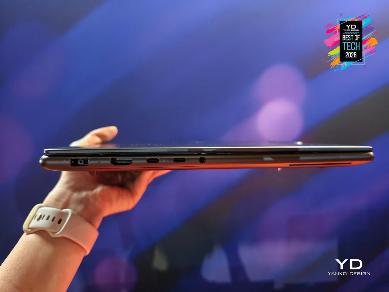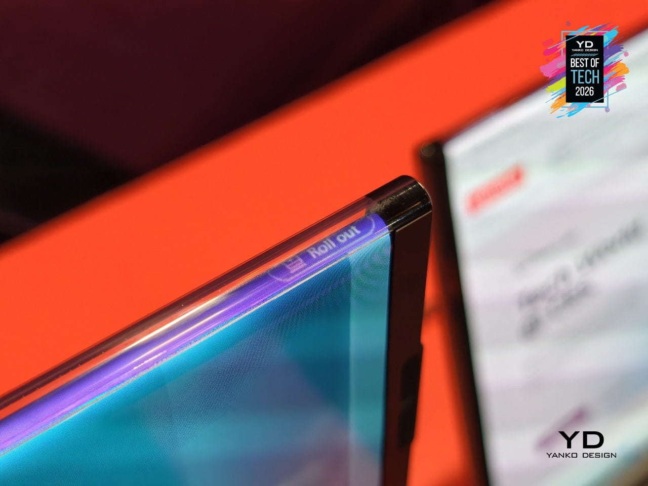 The concept is one of the world’s first out-folding devices with a world-facing display and expanding user-facing screen. Part of the rollable panel is always visible on the lid, even when the laptop is closed, while the rest extends upward when opened, transforming a compact 13.3-inch notebook into a near-16-inch workspace and delivering over 50 % more screen real estate without the bulk of a traditional 16-inch chassis.