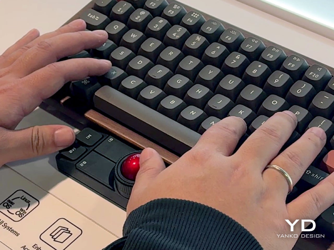 Seeing it here at the Keychron booth, tucked under a Q1 Pro, the immediate impression is how little space it occupies. The whole unit is only 135.2 mm long and 34.7 mm wide, so it fits neatly within the footprint of a standard tenkeyless board without feeling like an afterthought. They are using quiet Huano micro switches for the six buttons, which makes sense for a device meant to live right under your palms where an accidental loud click would be infuriating. The 25 mm ball is smaller than what you would find on a Kensington Expert, but it feels responsive enough for quick navigation. It is clearly designed for thumb operation, keeping your fingers on the home row and eliminating that constant, inefficient travel between keyboard and mouse.