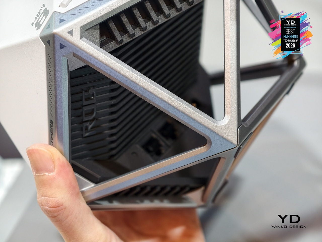 That shape is not just for show. A rigid exoskeleton frame wraps a ventilated inner core, giving the router plenty of airflow while keeping ports and heatsinks tucked into one face. The multifaceted body helps distribute antennas in three dimensions, supporting the tri‑band Wi‑Fi 8 radio stack that pushes more data, more efficiently, to many devices at once. NeoCore ends up feeling like an early glimpse of networking gear designed as part of a performance‑focused setup, where the box handling low‑latency gaming, 4K streaming, and dense device loads finally looks as intentional as the hardware it supports.