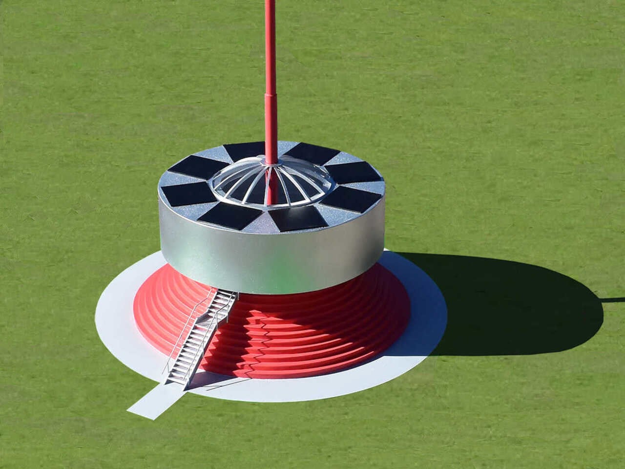 Instead of lifting people into the air, the pavilion lifts a 360-degree camera on a tall telescoping mast, then brings the view down to ground level. Inside a circular room, a ring of high-definition screens shows a live panoramic feed from the camera, synced with sound, so visitors see and hear exactly what they would if they were standing at the top of a traditional tower, without leaving the ground or climbing a long staircase.