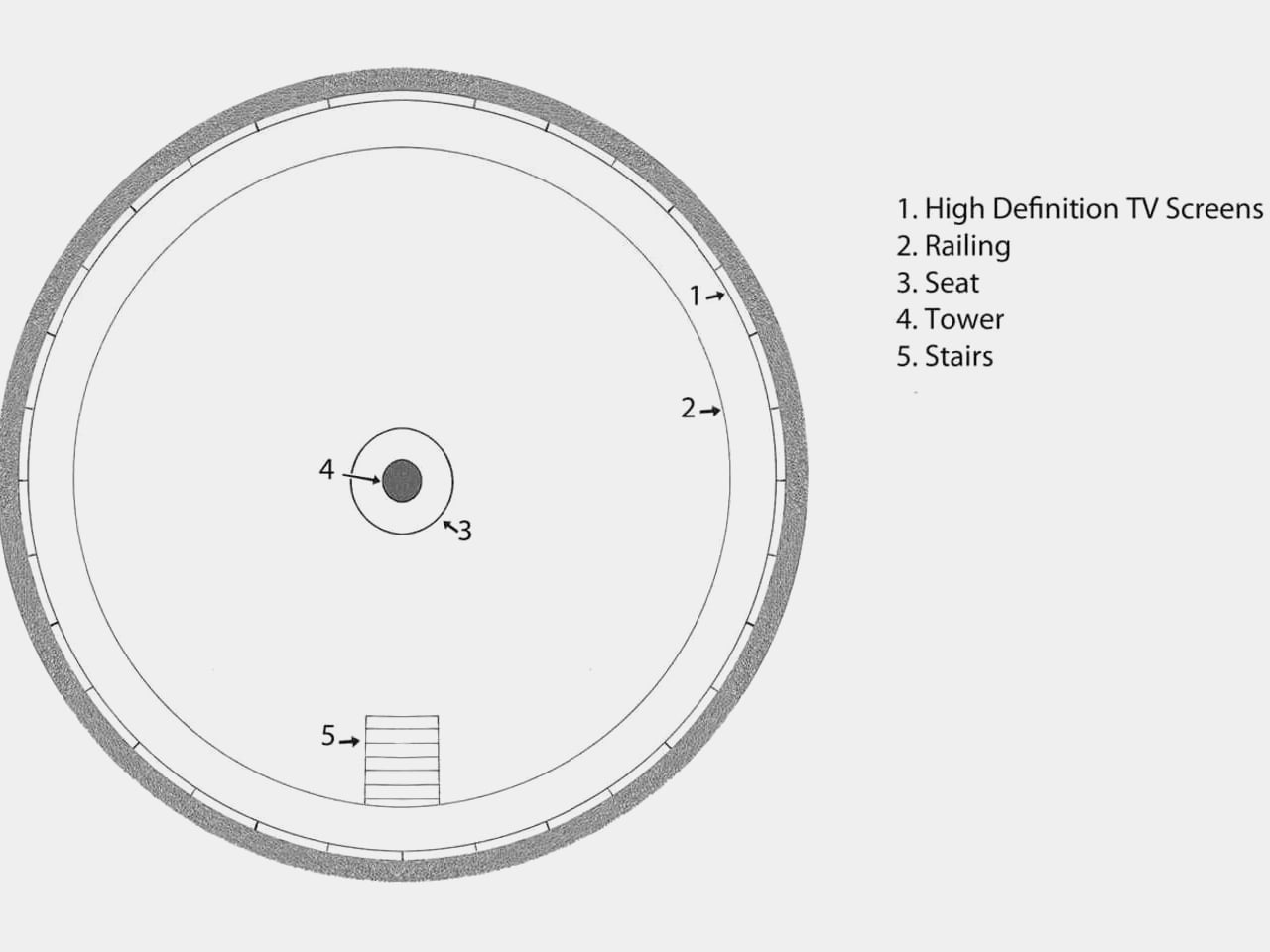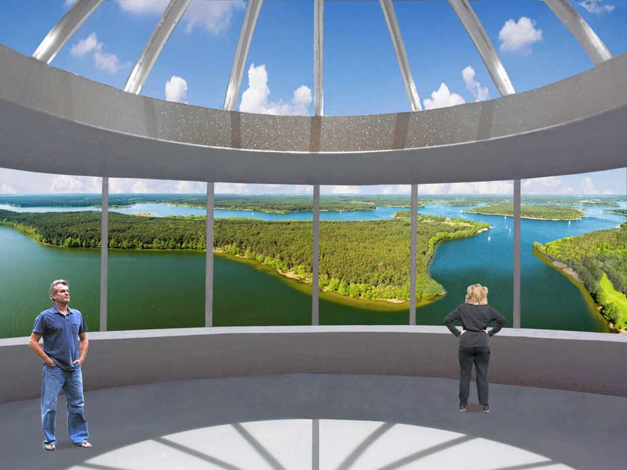 Walking into a round, open space where the walls behave like windows wraps you in a continuous horizon of forest, water, or city. A circular bench sits around the central mast, the floor stays open, and a guardrail keeps you a step back from the screens, so you are aware you are in a room, but your eyes are convinced you are somewhere higher and more exposed.