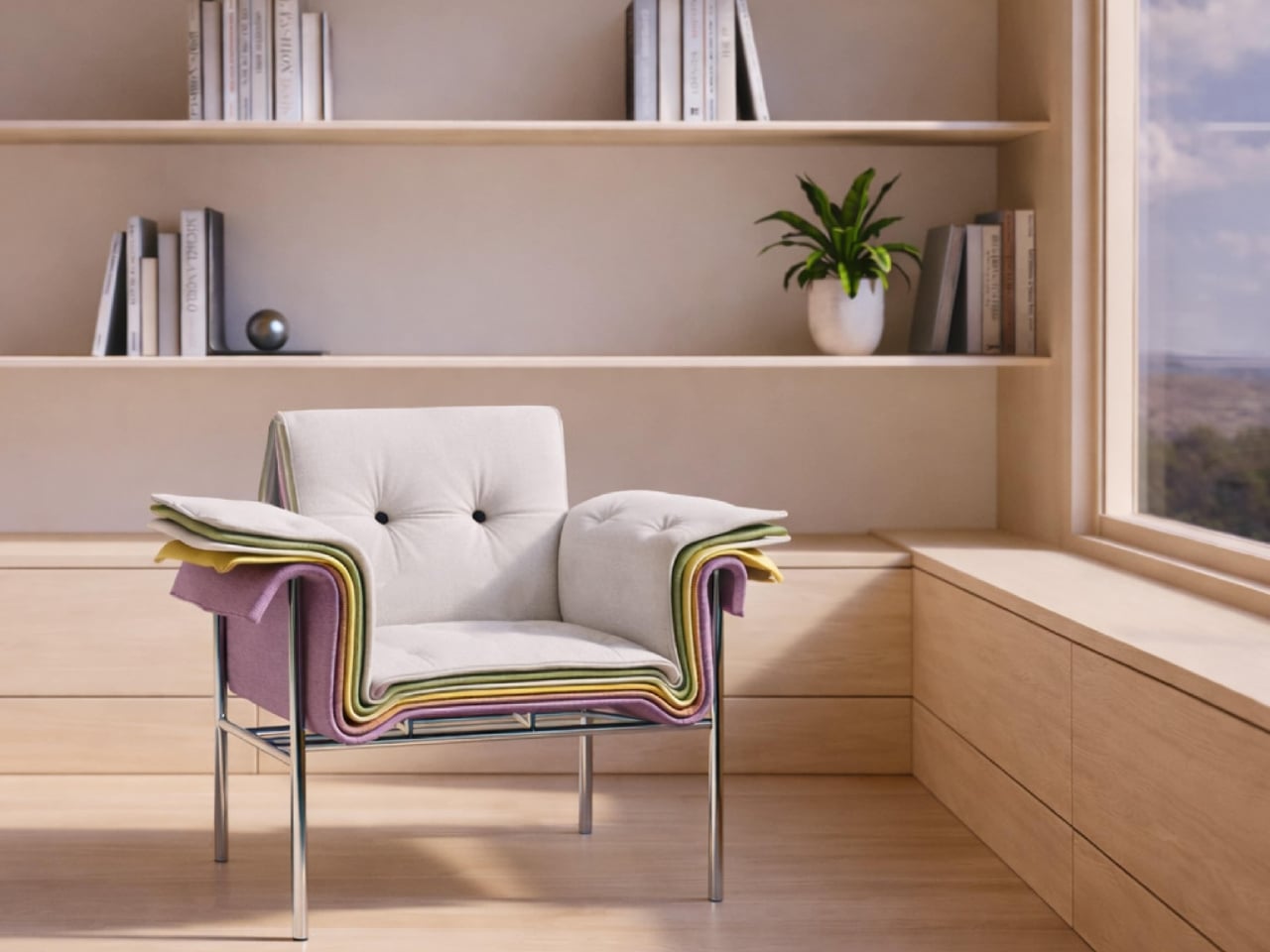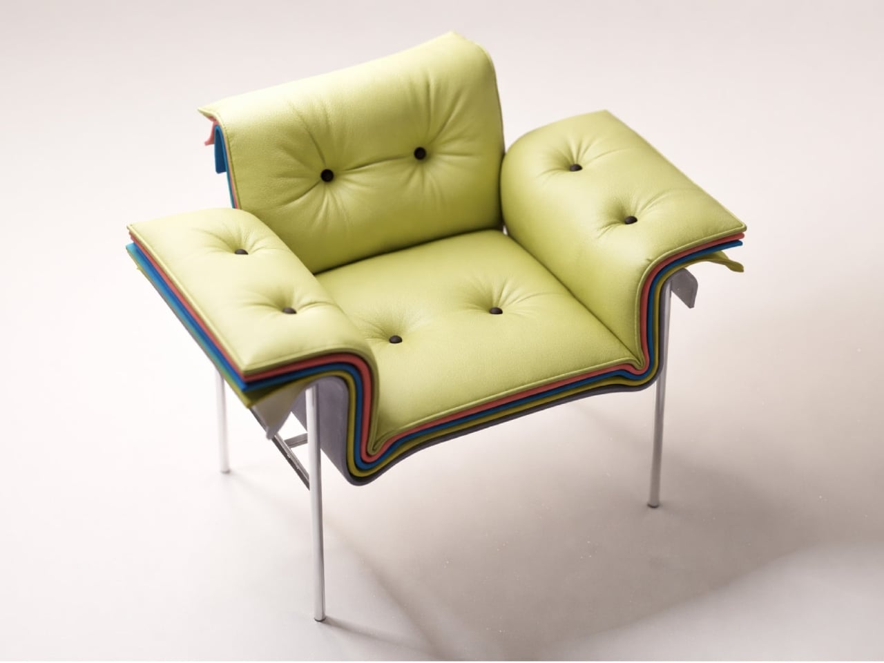 The concept is brilliantly simple yet visually striking. The chair features layers upon layers of cushioned upholstery stacked together, creating this incredible rainbow effect along the edges. Each layer represents a different color or texture, much like flipping through pages in a designer’s sample book. It’s the kind of thing that makes you do a double take. From one angle, you see a sophisticated seating piece with a clean, minimalist frame. From another, you catch those vibrant cascading layers that give it personality and depth.