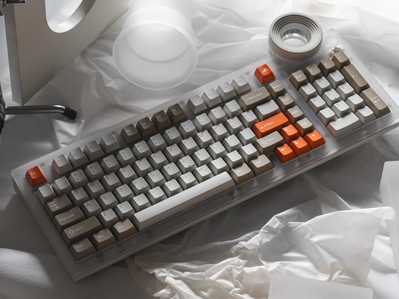The design references are specific. One version channels Tadao Ando’s Church of the Light with a matte concrete-gray shell and controlled RGB lighting, treating the keyboard like a minimalist architectural object. The translucent Frost Whisper and Night Ink editions take inspiration from Off-White x Rimowa’s see-through luggage, revealing the gold-plated PCB and mounts underneath. The structure and lighting become part of the composition, not just decoration.