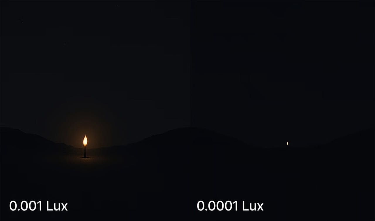 To understand what 0.0001 lux actually means, consider that a single candle at one meter is roughly one lux. By 0.001 lux, that glow is barely visible from 100m, and at 0.0001 lux it disappears to the naked eye. The Night Storm X3 still pulls full-color detail at that level, paired with optics tuned for a 13-degree field of view and 8x digital zoom, with minimal noise and interference thanks to its powerful AI imaging processing.