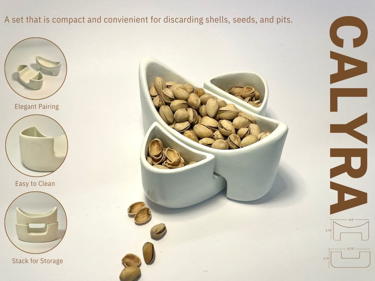 The concept focuses on the unglamorous part of eating, the shells, seeds, and pits that usually get handled as an afterthought. By folding that step into the serving piece itself, CALYRA turns a small annoyance into a smoother gesture. It’s the kind of quiet improvement that makes you wonder why most snack bowls still pretend the messy part doesn’t exist, as if ignoring it makes it less of a problem when you’re trying to enjoy pistachios without turning your table into a shell graveyard.