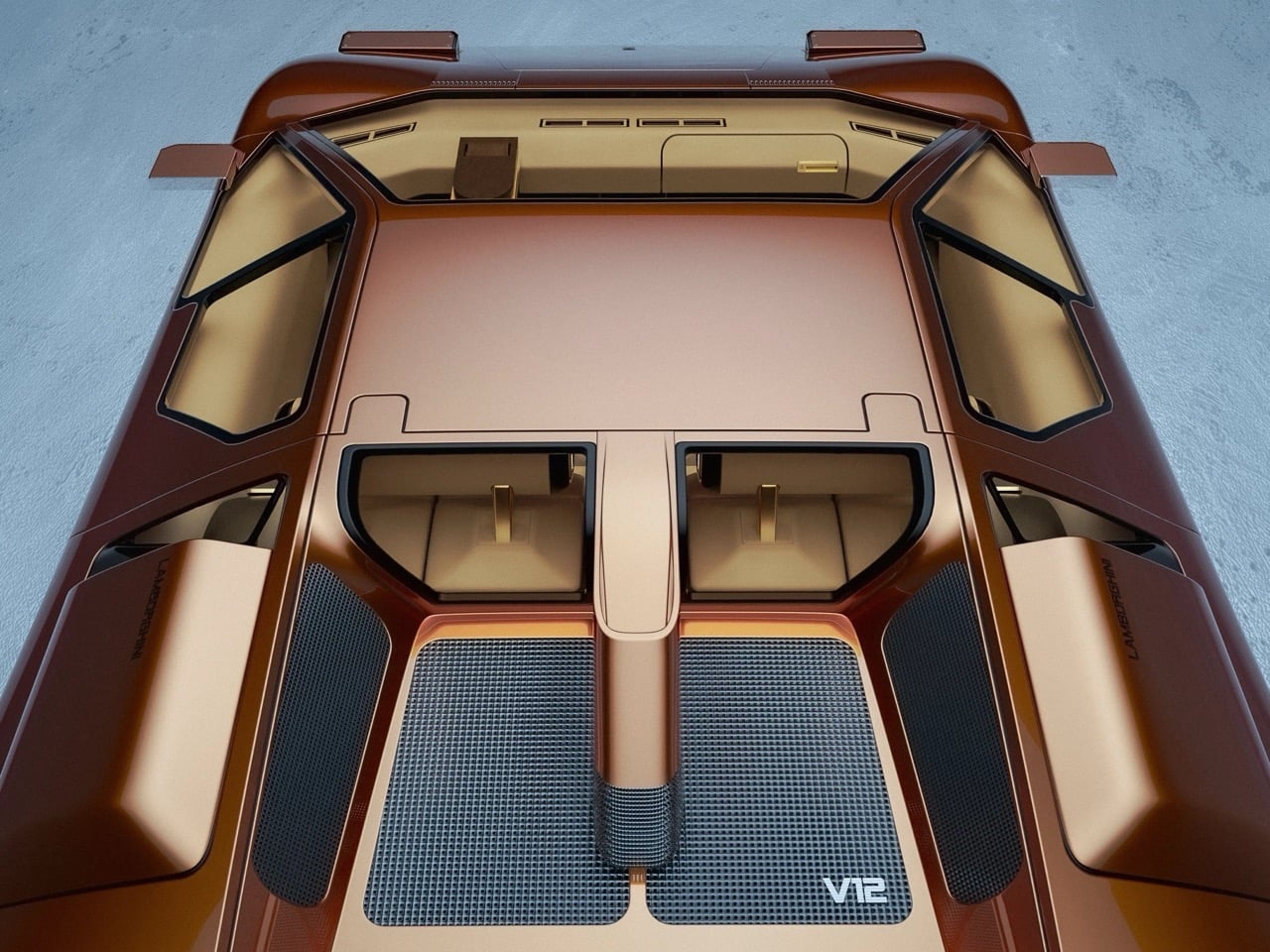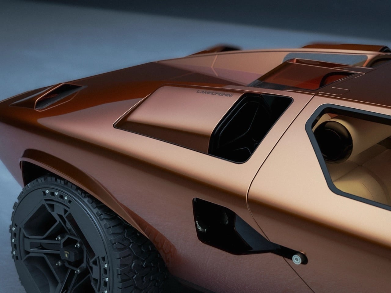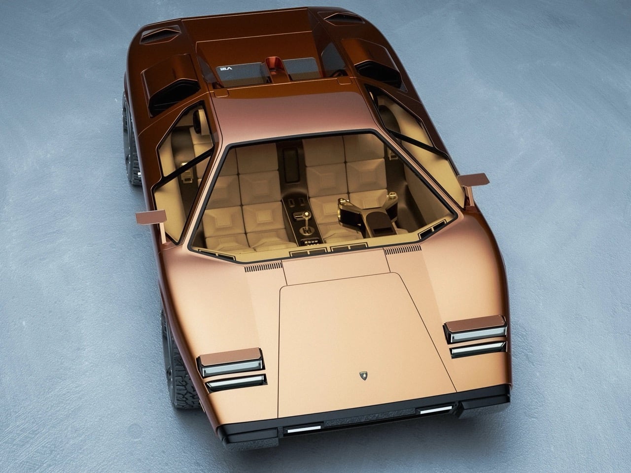 The interior shots show those iconic scissor doors. This is both wildly impractical for off-road use and absolutely essential for maintaining that theatrical Countach character. Imagine pulling up to a desert bivouac after a long stage and throwing those doors skyward. The cabin itself appears surprisingly spacious, with what looks like modern racing seats and a cockpit designed around actual usability rather than pure drama. The tan and bronze color palette inside the copper variant creates a warm, luxurious contrast to the rugged exterior, suggesting this is a machine that can tackle the Dakar Rally in style. You can see the structural reinforcements through the open doors, beefy roll cage elements that speak to serious safety considerations beyond the visual concept.