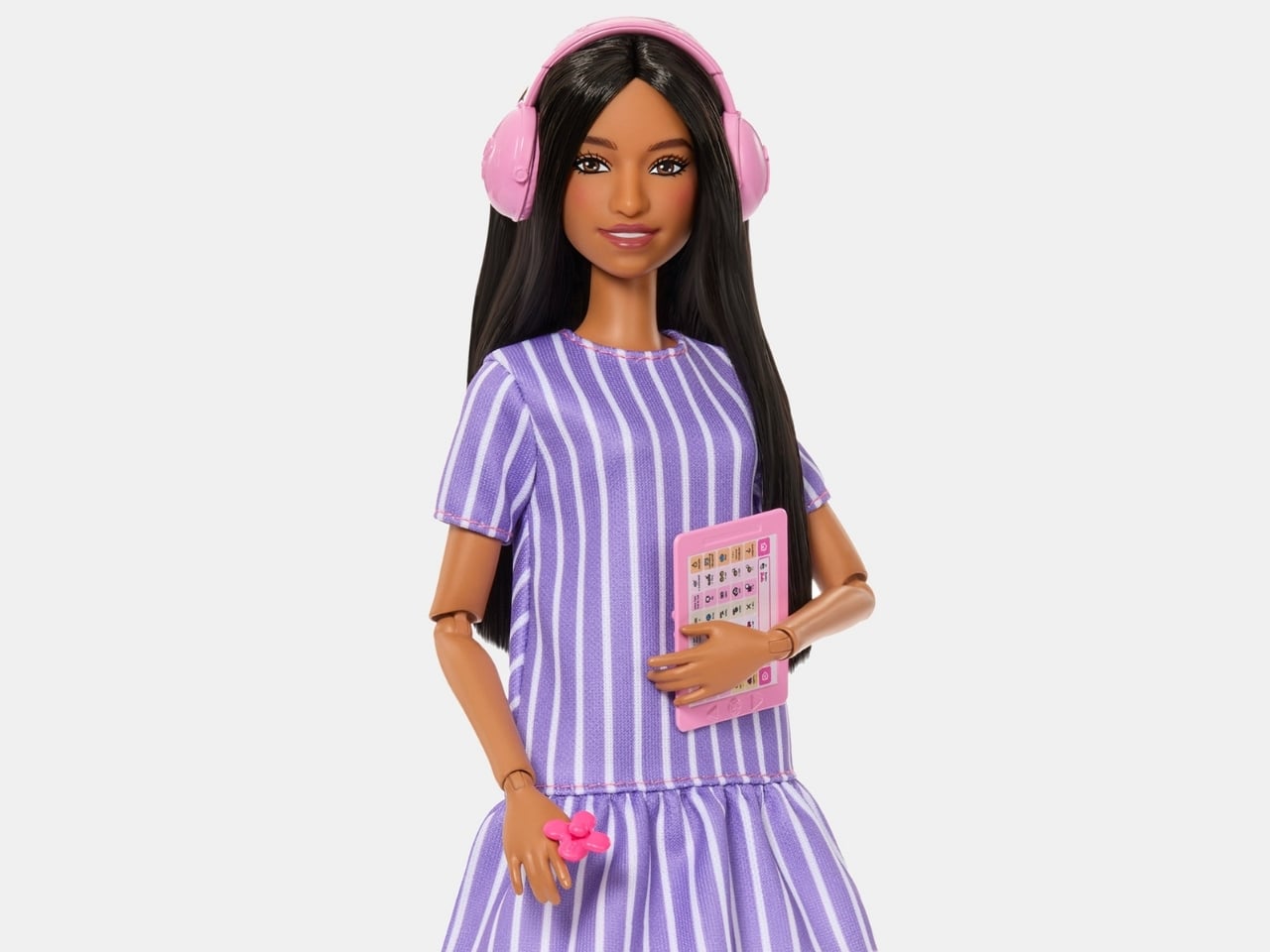 Let’s talk about those accessories, because this is where Mattel really showed up. The doll comes with noise-canceling headphones in bright pink, a finger clip fidget spinner that actually spins, and a tablet displaying augmentative and alternative communication apps. These aren’t random props thrown in for fun. They’re tools that many autistic people rely on every day to navigate a world that isn’t always designed with their sensory needs in mind.