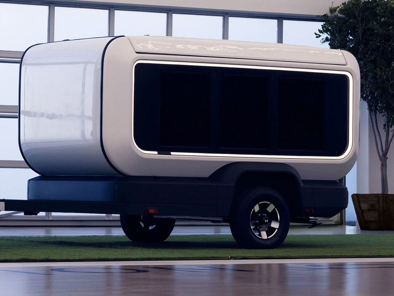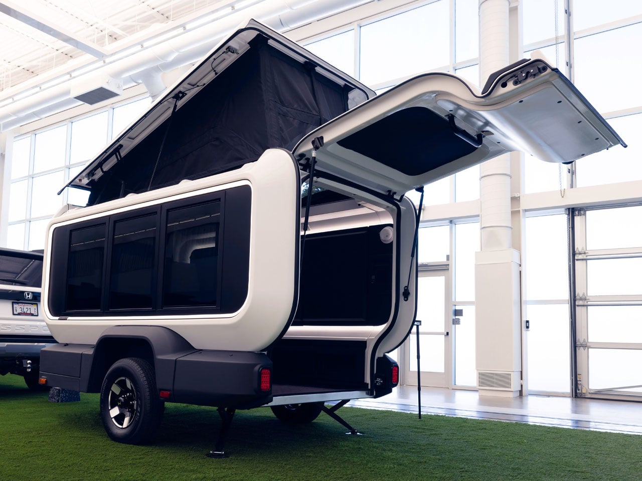 The primary objective behind designing the Base Station is to bring the camper experience to more families. In order to achieve that, Honda has kept the prototype trailer incredibly light, which means it can be towed by a wider range of vehicles, opening its accessibility to a bigger audience. The zero-emission towable Honda trailer features a fiberglass upper shell, which rests on a full aluminum cage, including the chassis.