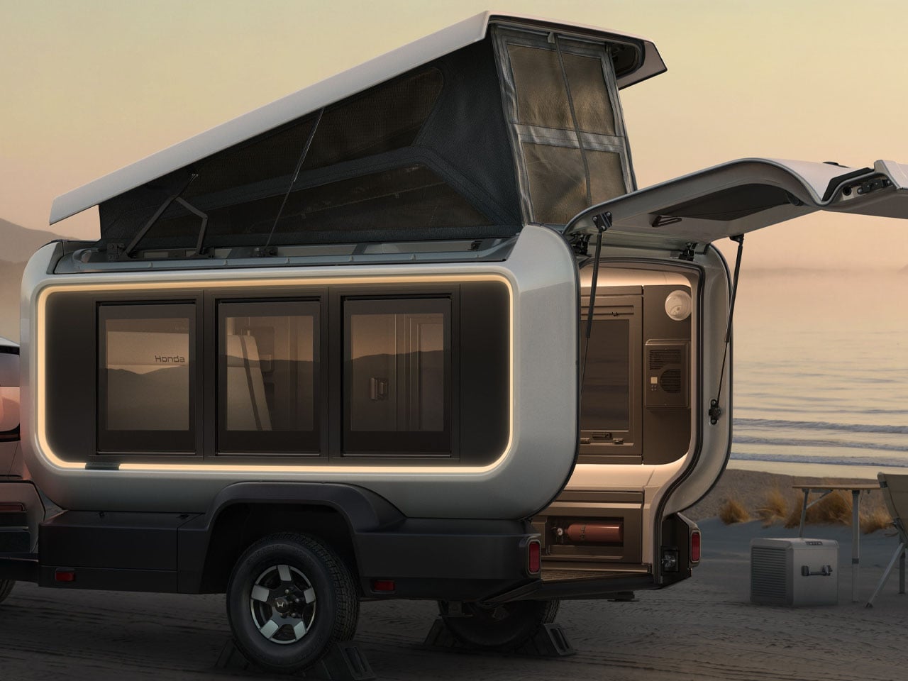 Designed to rattle the ultralight, modular camper market, the Honda trailer is customizable to make family camping more accessible and enjoyable. Dubbed the Honda Base Station, it is built to be spacious, airy and bright with a rear hatch entry, a slide-out side kitchen, and a pop-up roof that increases headroom and also creates space for additional sleeping at the campsite.