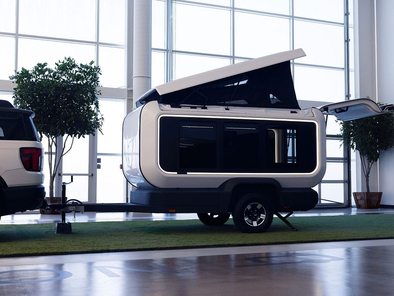 Courtesy of the tailgate entry, an optional teardrop-style door on the side, and five huge windows around the trailer, the interior is very bright. The Base Station opens up to become spacious and packs power options to make it a capable off-grid camper. On the outside, it doesn’t have anything distinct to show, except for the color-changing LED light strip installed around the trailer’s perimeter. On the inside, it’s a whole new ballgame.