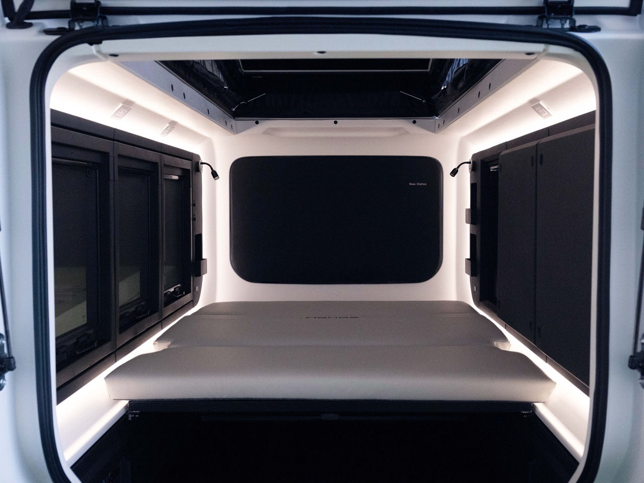 Upon entry you get a low floor, useable for storage and maybe hauling a bike. The queen-size bed on the far end folds down from a futon position to sleep a couple. Modular features allow people to use the Base Station however they want. For instance, the roof can be popped up to create seven feet of stand-up space, or use it for an optional bunk bed. The five windows on the sides can be left as they are or replaced with optional features like a slide-out kitchen, an air conditioner, or an outdoor shower, all while still keeping the overall size of the camper compact enough to fit in an average garage or parking lot.