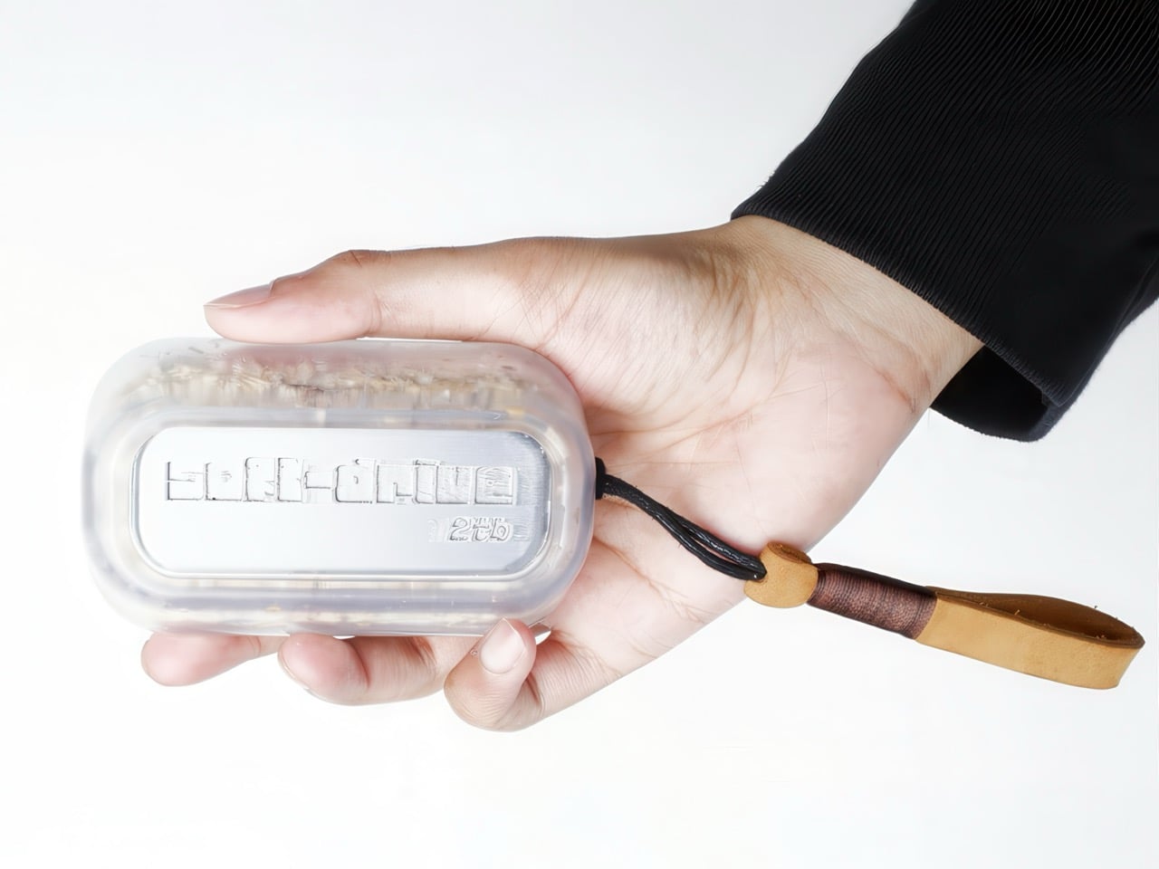 The translucent casing shows off the wispy, organic texture of mycelium mixed with hemp, wrapped around a standard memory card and heat sink. There’s a woven lanyard attached like it’s a charm you’d wear. It holds 8GB, which sounds quaint until you realize that’s exactly the point. This isn’t about competing with cloud storage. It’s about asking why we ever thought it was a good idea to hand over our entire digital lives to massive, energy-guzzling server farms we’ll never see or control.