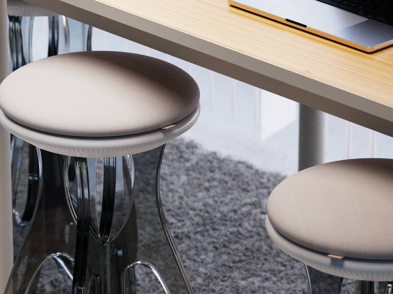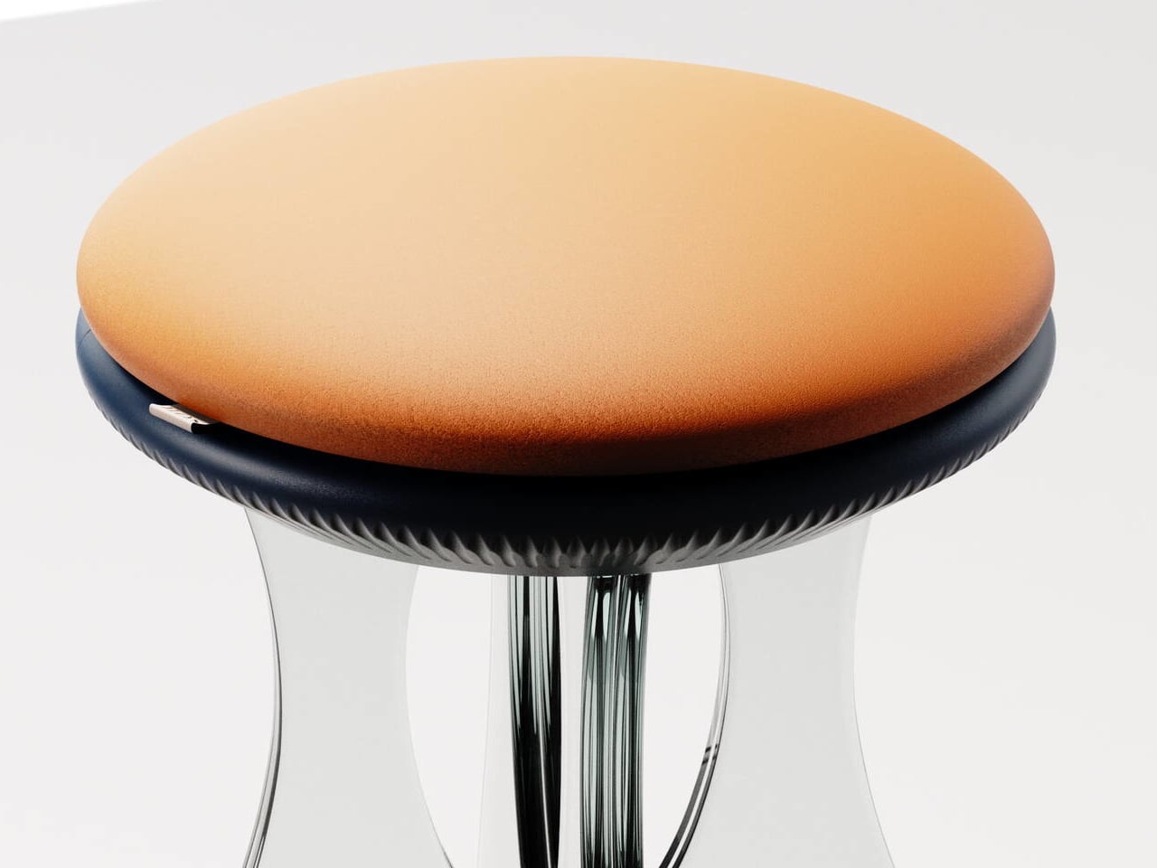 The upholstered top sits above the glass base as a soft disc that comes in more than thirty colour finishes. Upholstery is offered in fabric and vegan leather, with Deep Sienna being the leather option and the rest using elevated textiles. That palette lets the same glass base feel quiet and monochrome in one space or warm and expressive in another, without losing its sculptural identity.