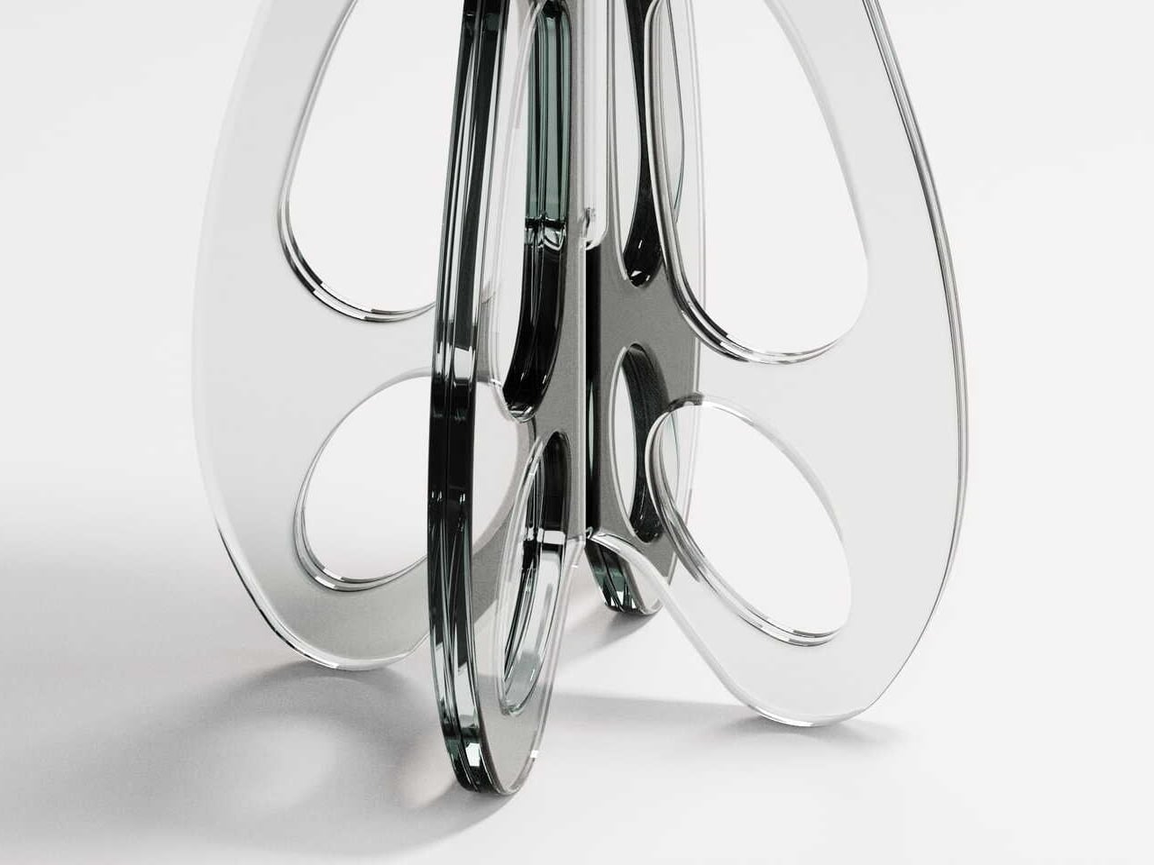 Instead of chunky wooden legs, Tide uses transparent glass fins that fold and loop around a central axis, carrying load through geometry. The panels curve out and back in, sharing weight across their profiles, so strength comes from the path the glass takes rather than thickness. It flips the usual hierarchy where glass is treated as fragile skin and heavier materials are trusted with structural work.