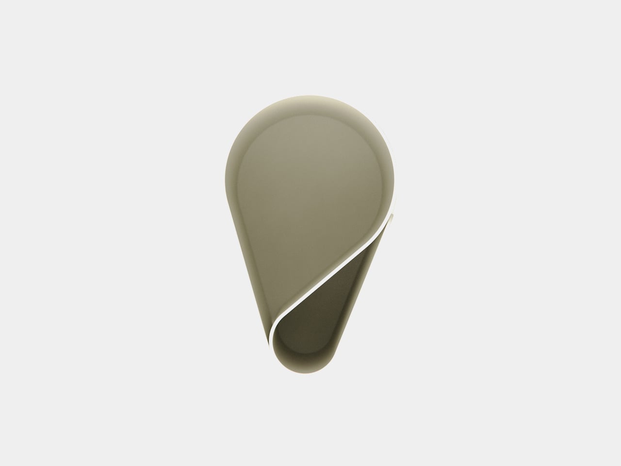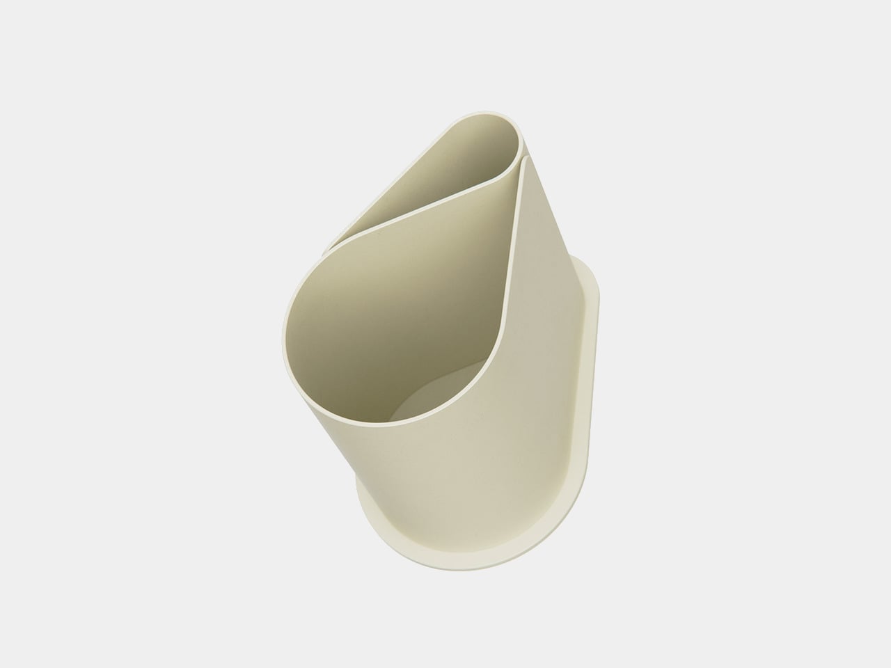 The object is made from bent and welded sheet metal, forming a nested, teardrop-like footprint that balances minimalism with clear function. The outer shell wraps around an inner wall to create two compartments in one continuous gesture, so it reads as a single form rather than a cluster of tubes. The result feels industrial and precise but not cold or overdesigned, more like a small sculpture that happens to organize your pens.