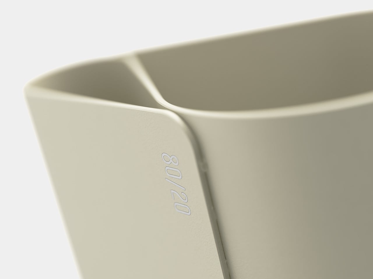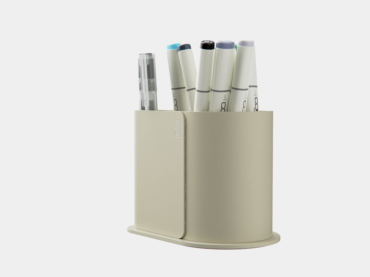 A small “80/20” mark on the side acts as a quiet nod to the idea driving the form, not a loud logo. It is a reminder that the pot is not just another cylinder; it is a physical diagram of how most of us actually work, a big space for the few tools that matter most, and a smaller one for everything else.