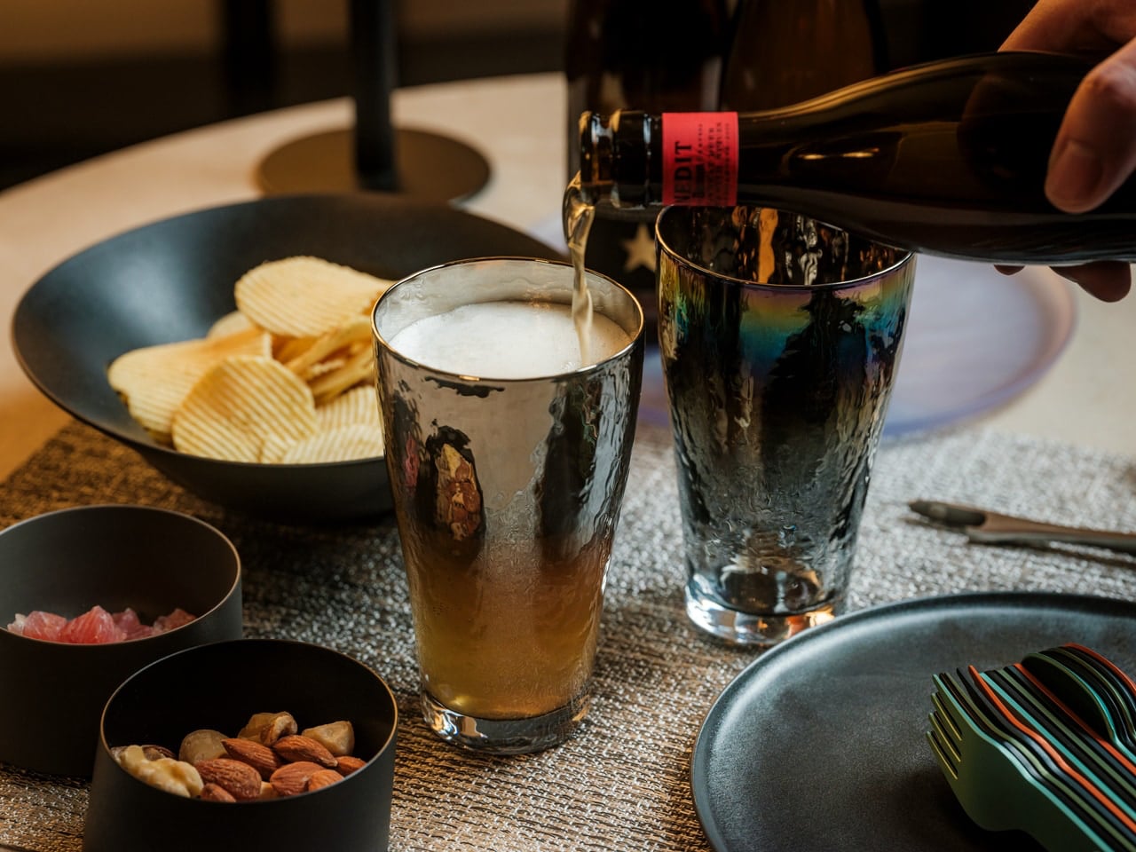 Visually understated yet distinctive, Prism’s light-reactive finish subtly shifts with movement, adding depth without excess. Etched motifs draw from enduring Japanese symbols of continuity and prosperity, reinforcing its sense of permanence and purpose. Designed to be used daily rather than displayed, the Prism Titanium Beer Glass prioritises clarity, tactility, and intention—transforming an ordinary pour into a composed, well-considered experience grounded in design excellence.
