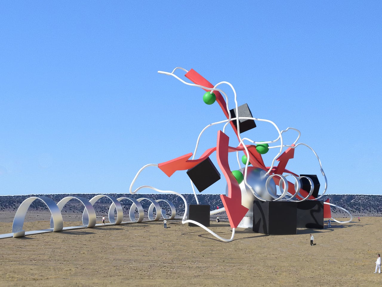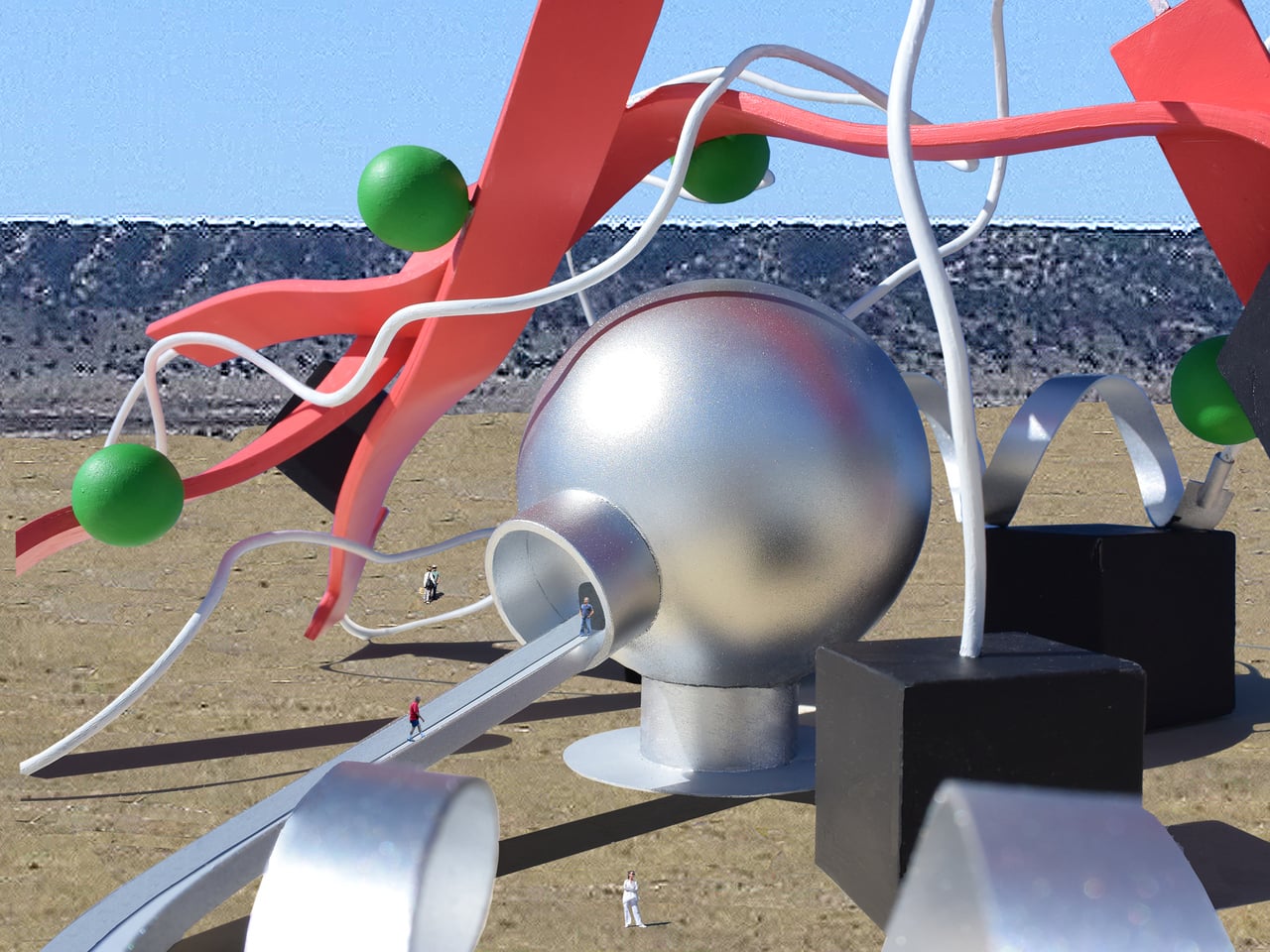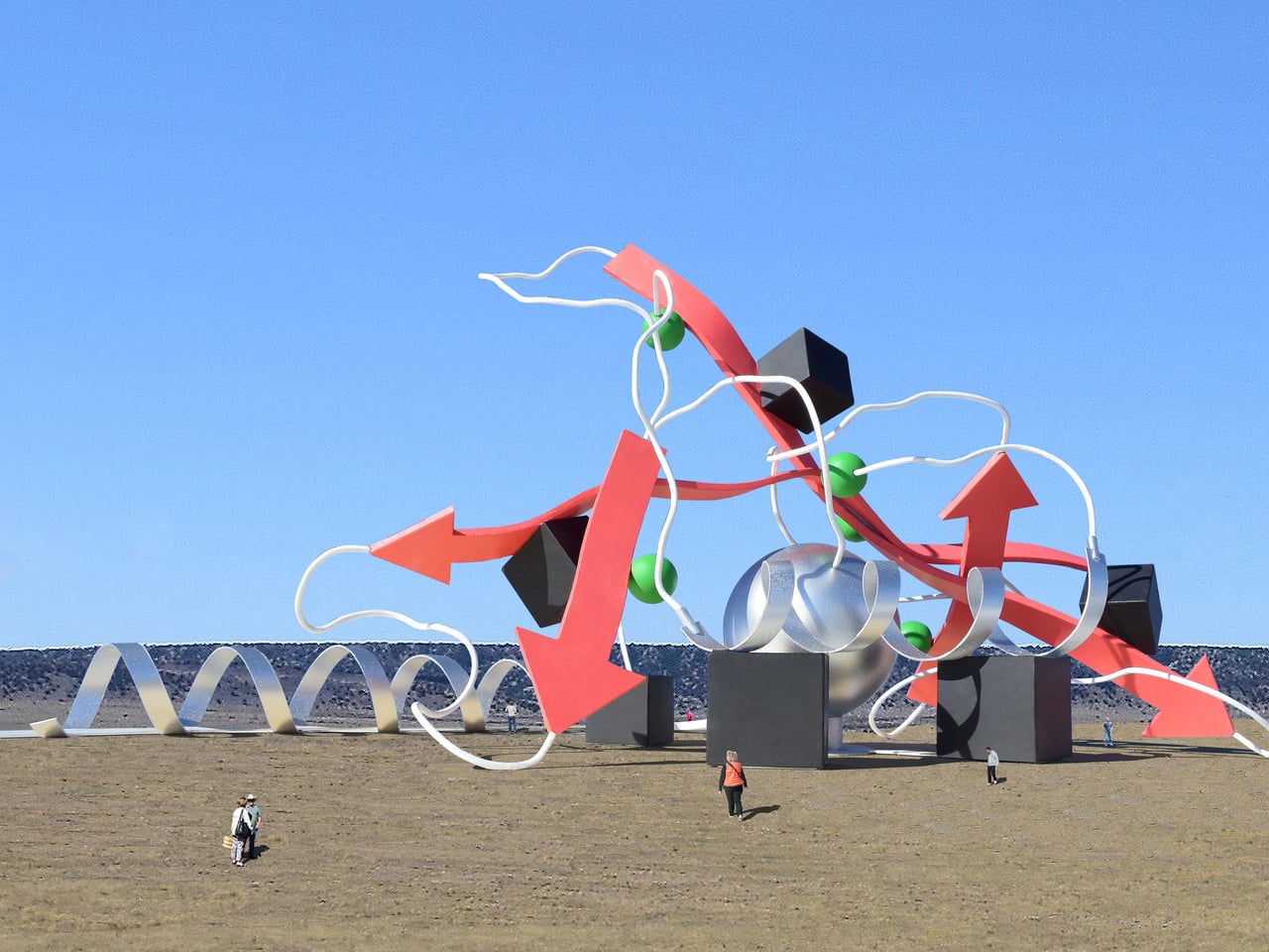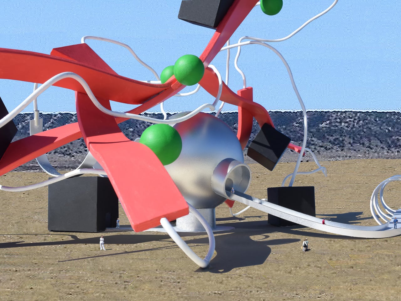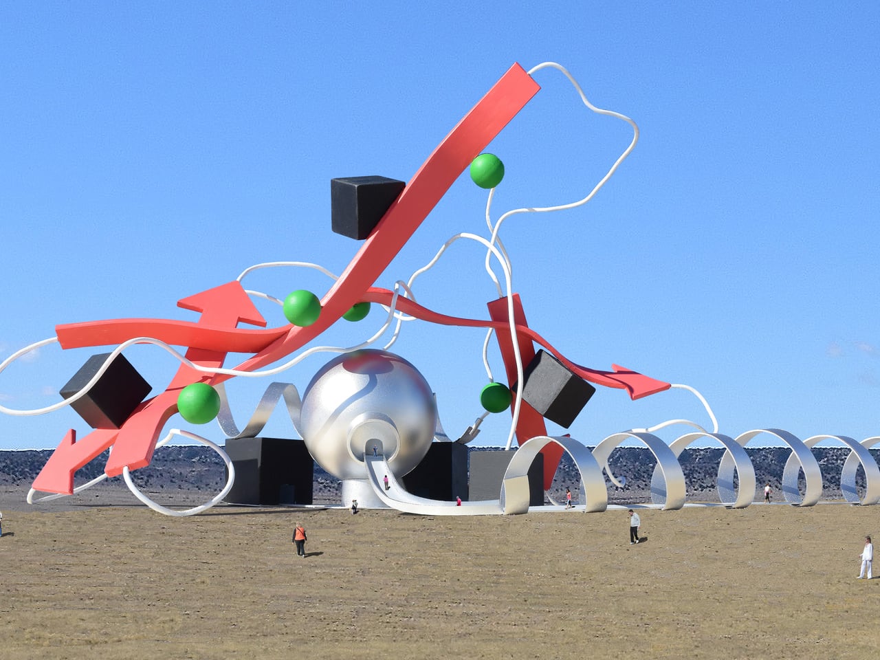 The three black cubes house research spaces, and the large silver sphere forms the exhibition hall, but they sit entangled in bright red arrows, white coils, green spheres, and smaller cubes. The functional rooms are inside these solids while symbolic elements wrap around and pierce them, so the working building is literally knotted up in its own subject matter. You would approach across an open landscape and see a giant folded molecule rising from the ground.