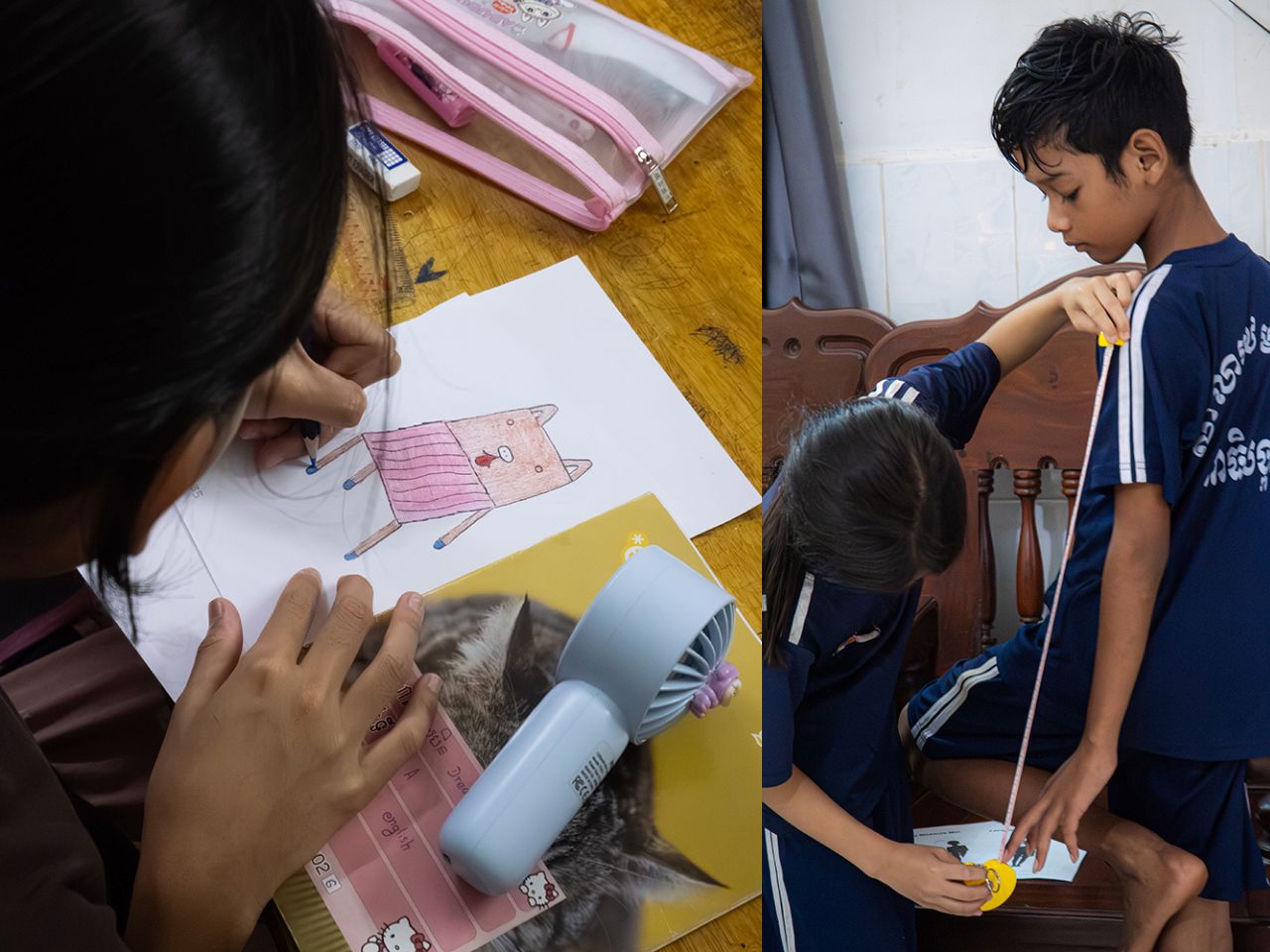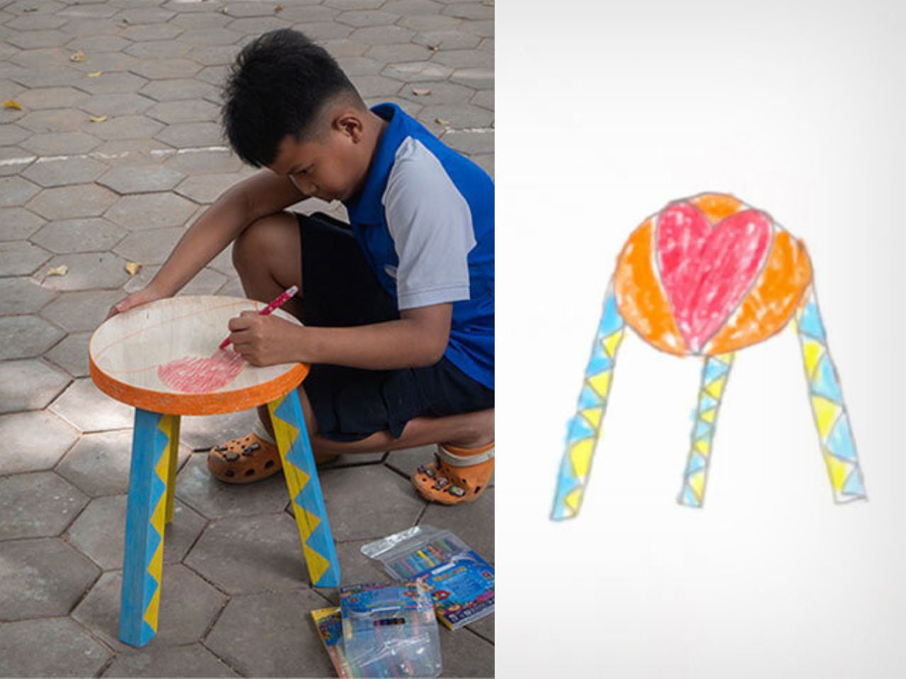 Created in collaboration with students from an English school in Siem Reap, the project places children at the center of the design process. Rather than correcting or refining their ideas to fit adult notions of good design, the project embraces the rawness of children’s imagination. More than seventy children participated, each drawing their own version of a chair or stool as an initial exploration of form, balance, and function. These drawings were treated as genuine starting points rather than symbolic exercises.