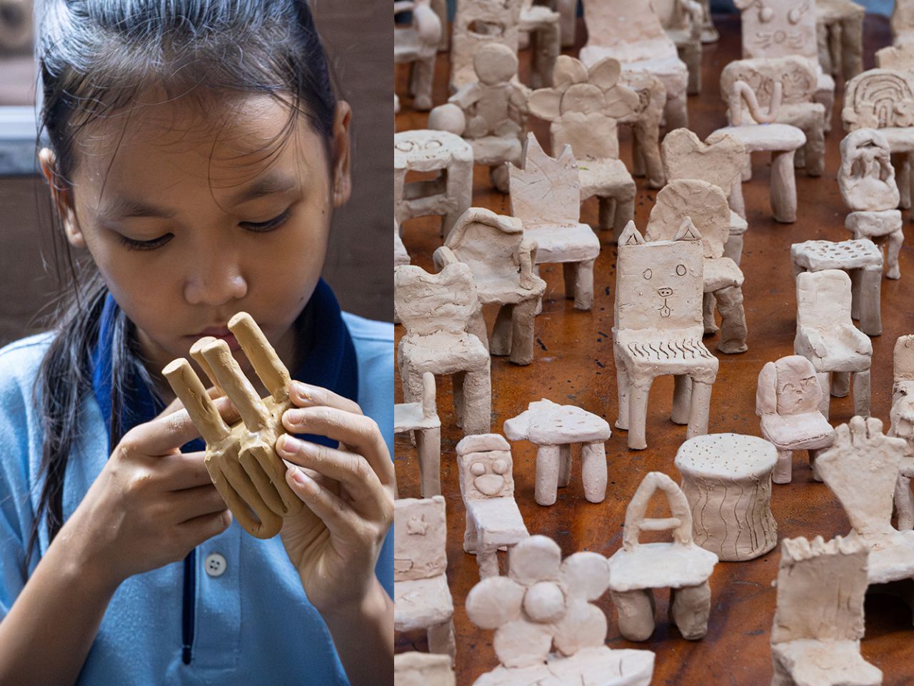 To translate drawings into three-dimensional objects, the children created clay prototypes of their chairs. Clay was chosen for its low cost, accessibility, and ease of manipulation, allowing children to freely experiment with volume and structure. These models helped bridge the gap between imagination and fabrication and served as references for the final chairs produced by Taekhan Yun. The resulting forms retain the charm of the original drawings with crooked legs, unexpected angles, and playful proportions while remaining structurally sound and functional.