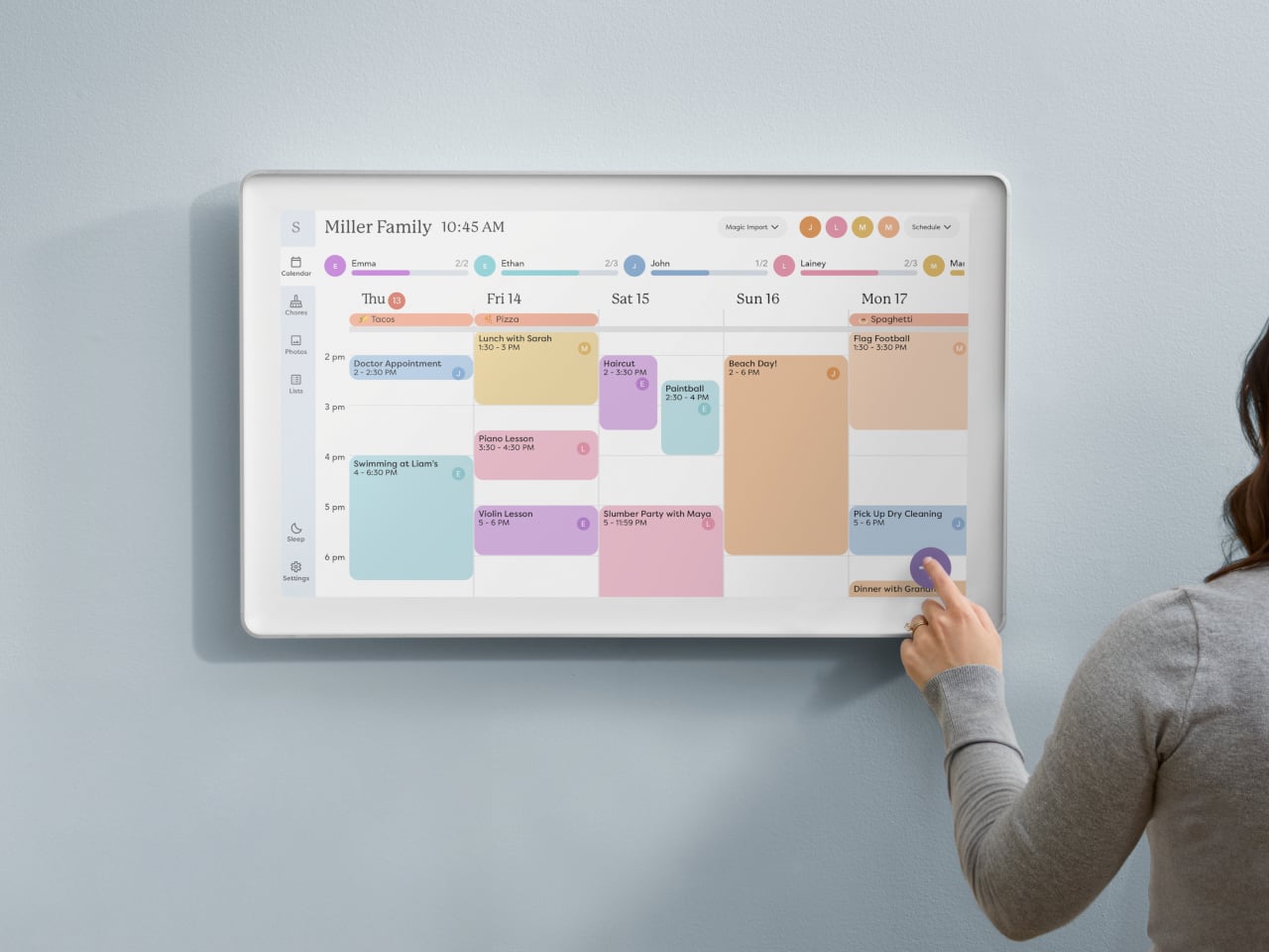 A typical morning means everyone glances at the calendar on the way to coffee. Color-coded events show who is doing what, lists and meal plans sit alongside the schedule, and everything syncs with the digital calendars people already use on their phones. Instead of hunting through apps or checking multiple sources, the day’s plan is just there, big enough that no one can pretend they missed soccer practice.