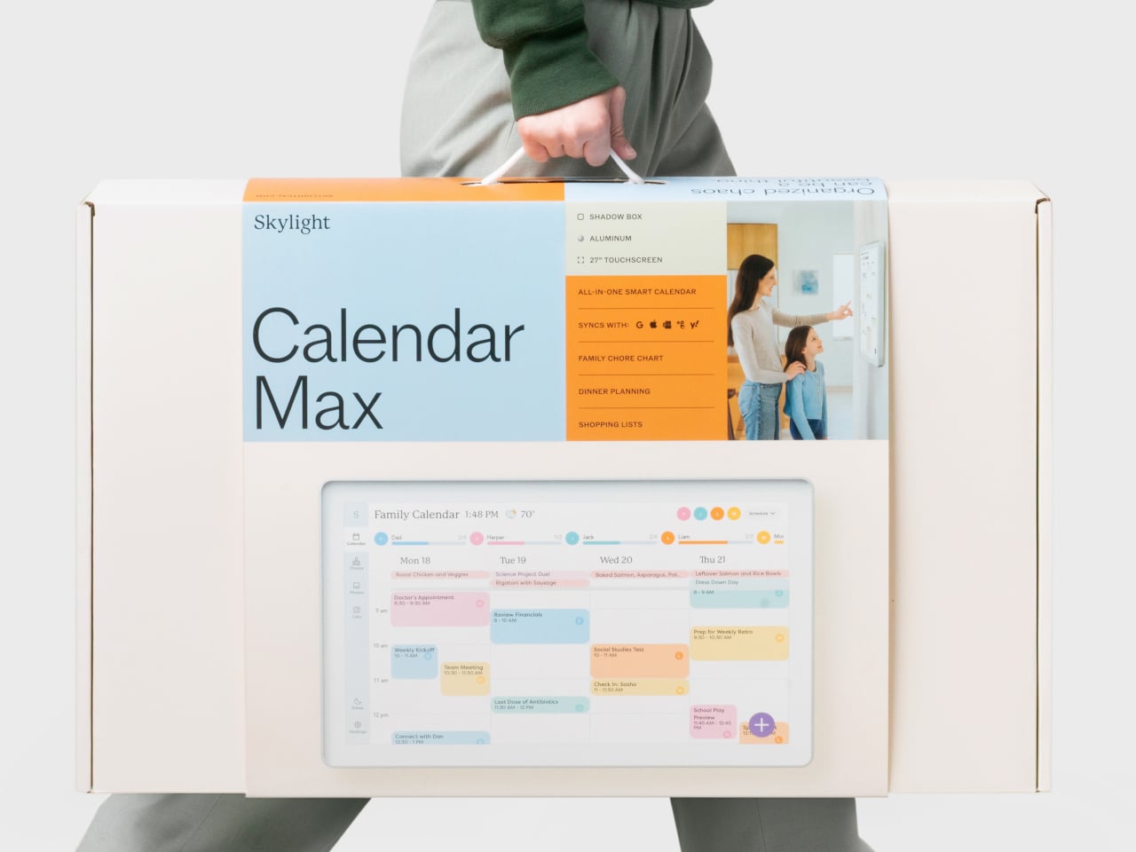 Skylight’s 27-inch Calendar Max is a digital calendar that starts from the wall, not the app. It is a large wall-mounted touchscreen designed to be a central family hub, but the industrial design leans toward a floating frame rather than a black rectangle. The goal is to feel like part of the decor while still being big and clear enough to see from across the room.