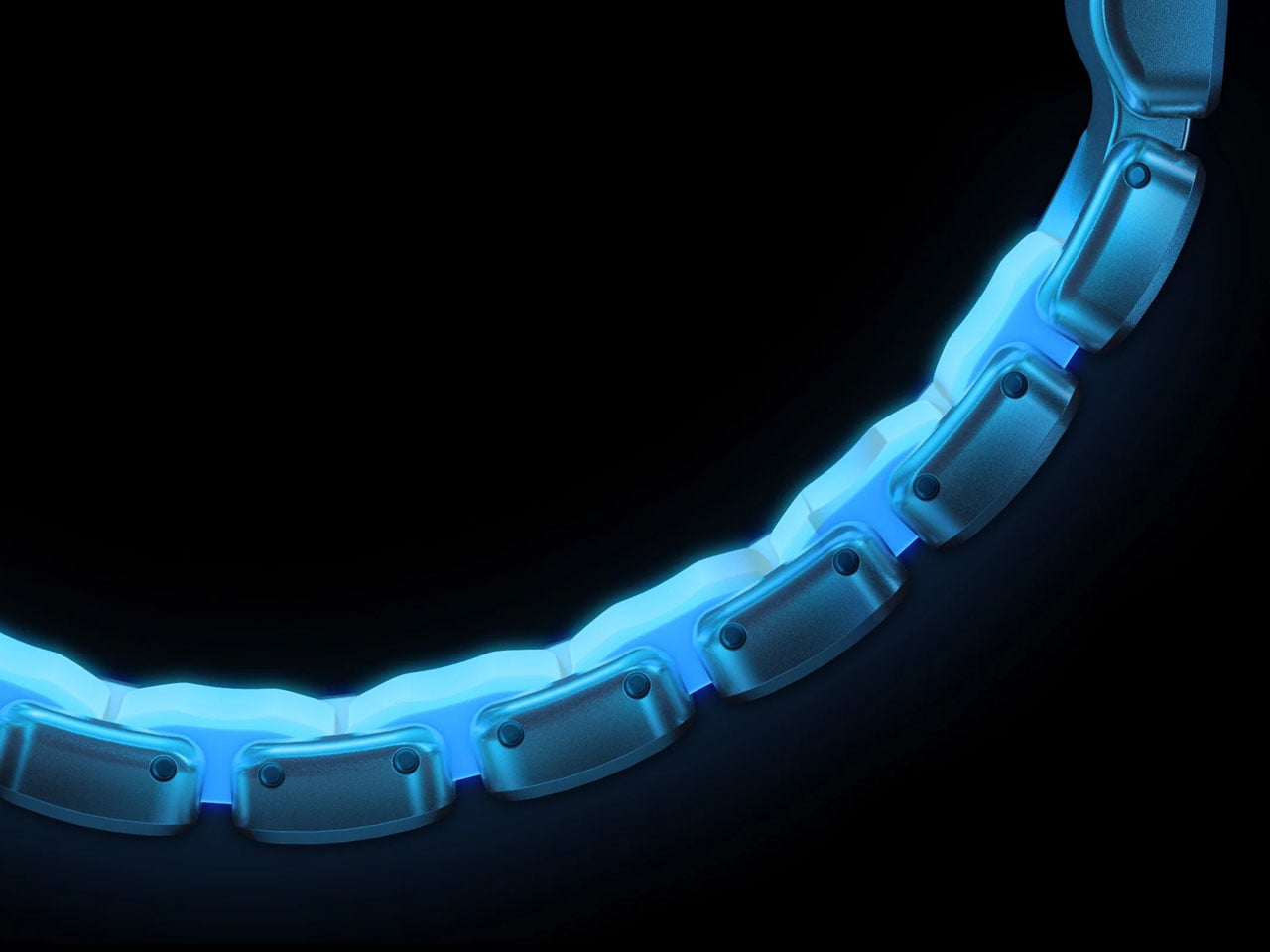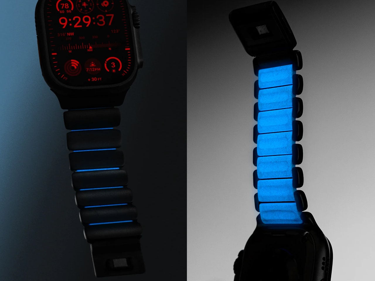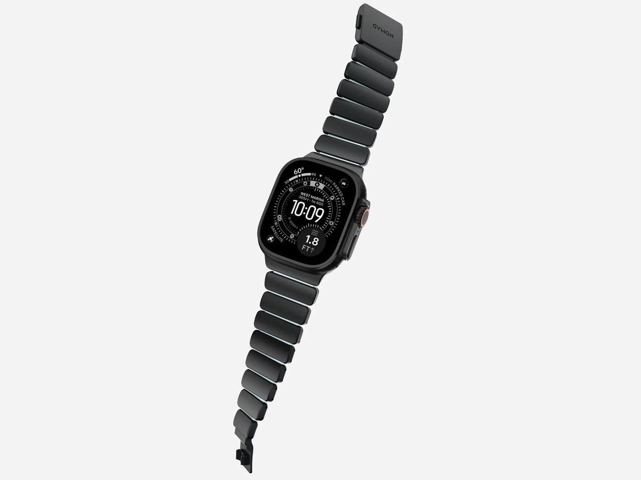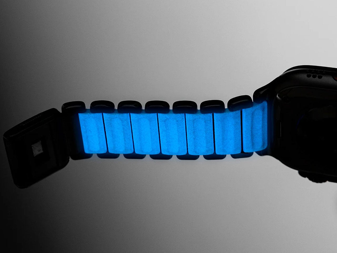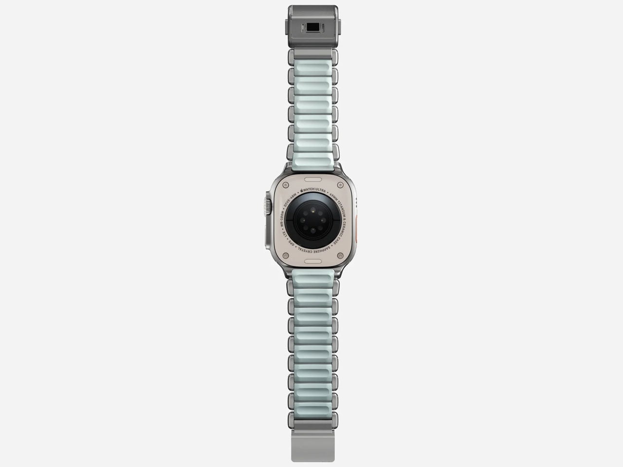 What sets the Icy Blue Glow edition apart is the photoluminescent material infused into the interior FKM links. This compound absorbs light throughout the day and emits a soft blue glow in low-light conditions. The glowing effect is more subdued in typical environments because the material sits beneath the titanium, but it still produces a cool, visual accent in the dark that distinguishes it from more conventional bands. Nomad equips this limited version with a custom magnetic clasp engineered for secure closure and corrosion resistance. The clasp remains fastened through daily movements yet opens easily when the sides of the buckle are squeezed. Users can also fine-tune the band’s fit using the included tool to remove or add links, making customization straightforward.